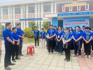 Đại diện đội hình các chiến sĩ của trường Đại học Y dược Tp Hồ Chí Minh báo cáo các công trình phần việc đã được các bạn triển khai thực hiện trong hơn một tuần qua tại mật trận xã Tập Ngãi.
