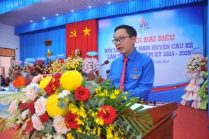 Đồng chí Trần Trí Cường, UVBCH Trung ương Đoàn, Bí thư Tỉnh đoàn, Trưởng Ban tổ chức Đại hội Hội LHTN Việt Nam các cấp phát biểu chỉ đạo Đại hội đại biểu Hội LHTN Việt Nam huyện Cầu Kè,