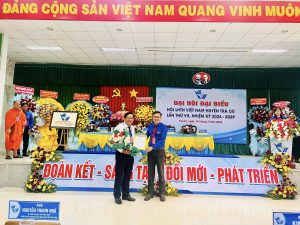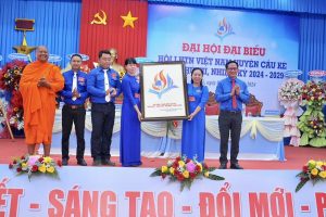 Đồng chí Trần Trí Cường, UVBCH Trung ương Đoàn, Bí thư Tỉnh đoàn, Trưởng Ban tổ chức Đại hội Hội LHTN Việt Nam các cấp tặng quà chúc mừng Đại hội đại biểu Hội LHTN Việt Nam huyện Cầu Kè khóa VII, nhiệm kỳ 2024 – 2029 (điểm cấp huyện của UBH tỉnh)