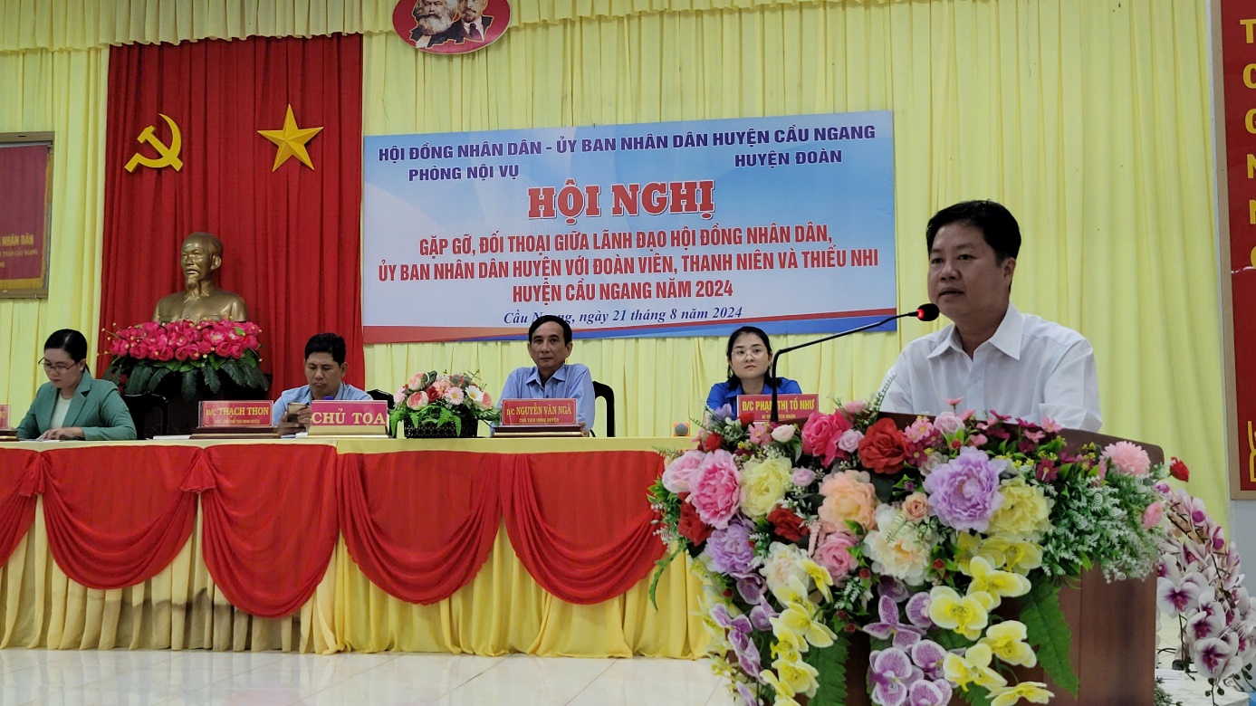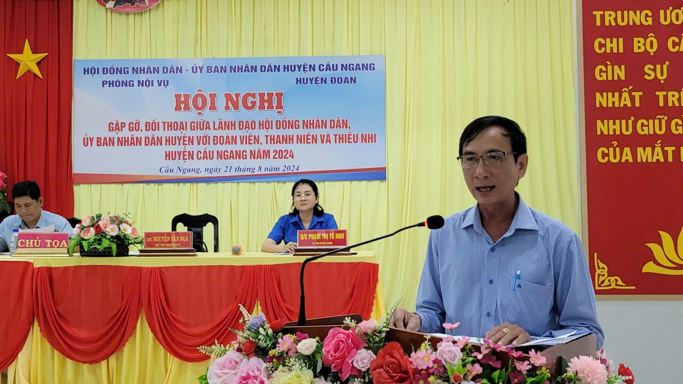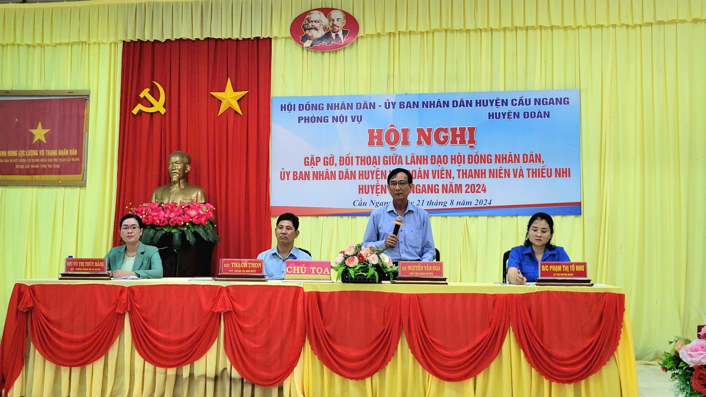 Ngày 21/8/2024, tại Hội trường Ủy ban nhân dân thị trấn Cầu Ngang, Huyện đoàn Cầu Ngang phối hợp Phòng Nội vụ tổ chức hội nghị gặp gỡ, đối thoại giữa lãnh đạo Hội đồng nhân dân, Ủy ban nhân dân huyện với đoàn viên, thanh niên và thiếu nhi năm 2024.