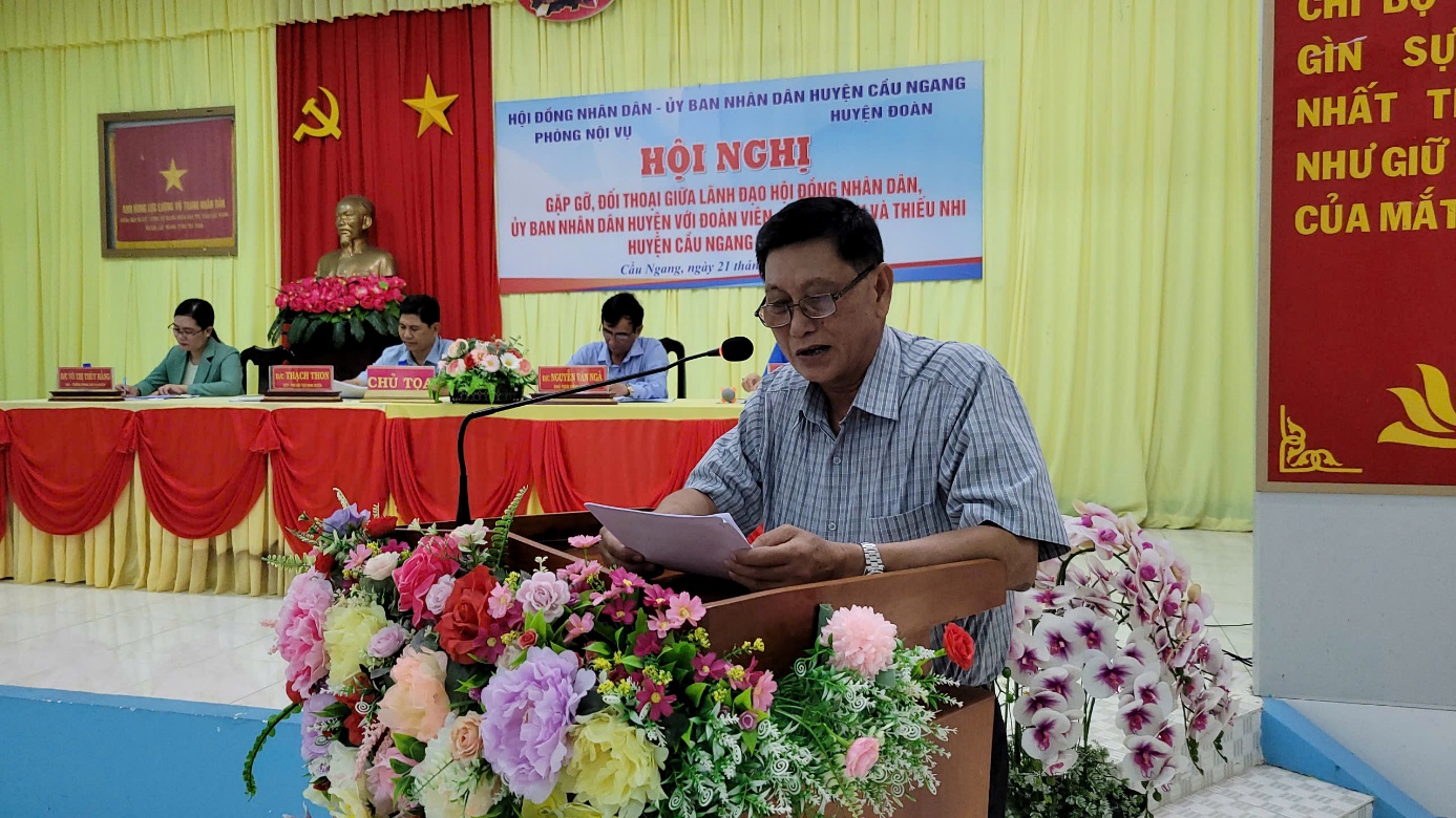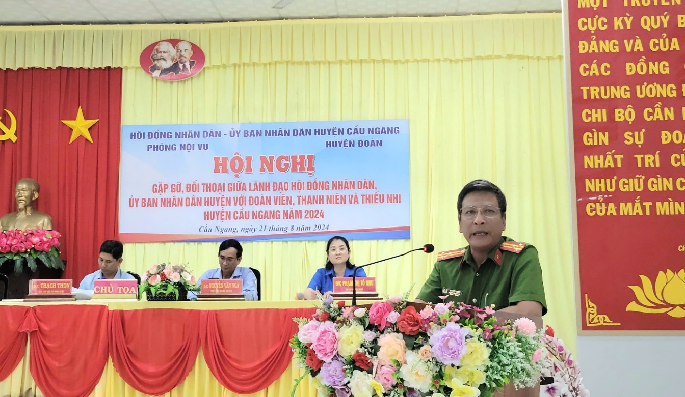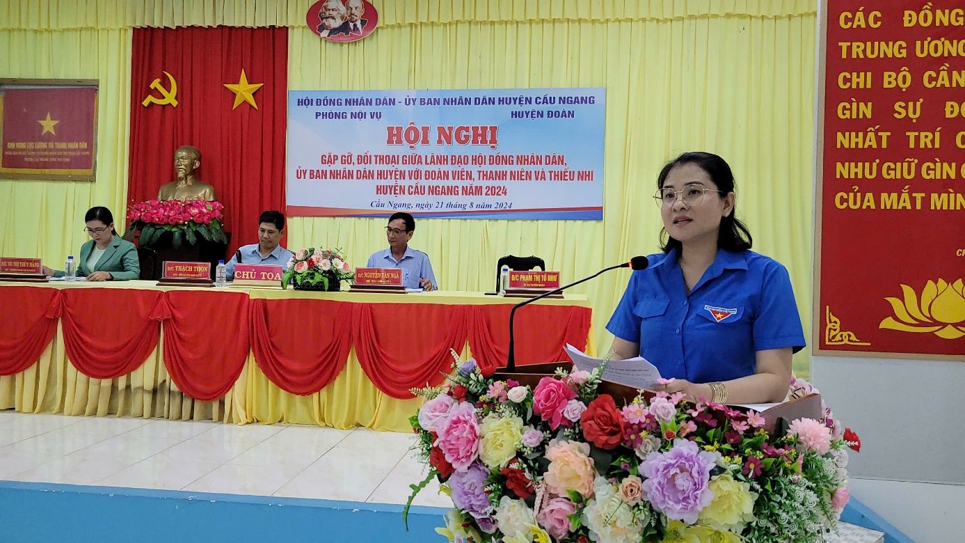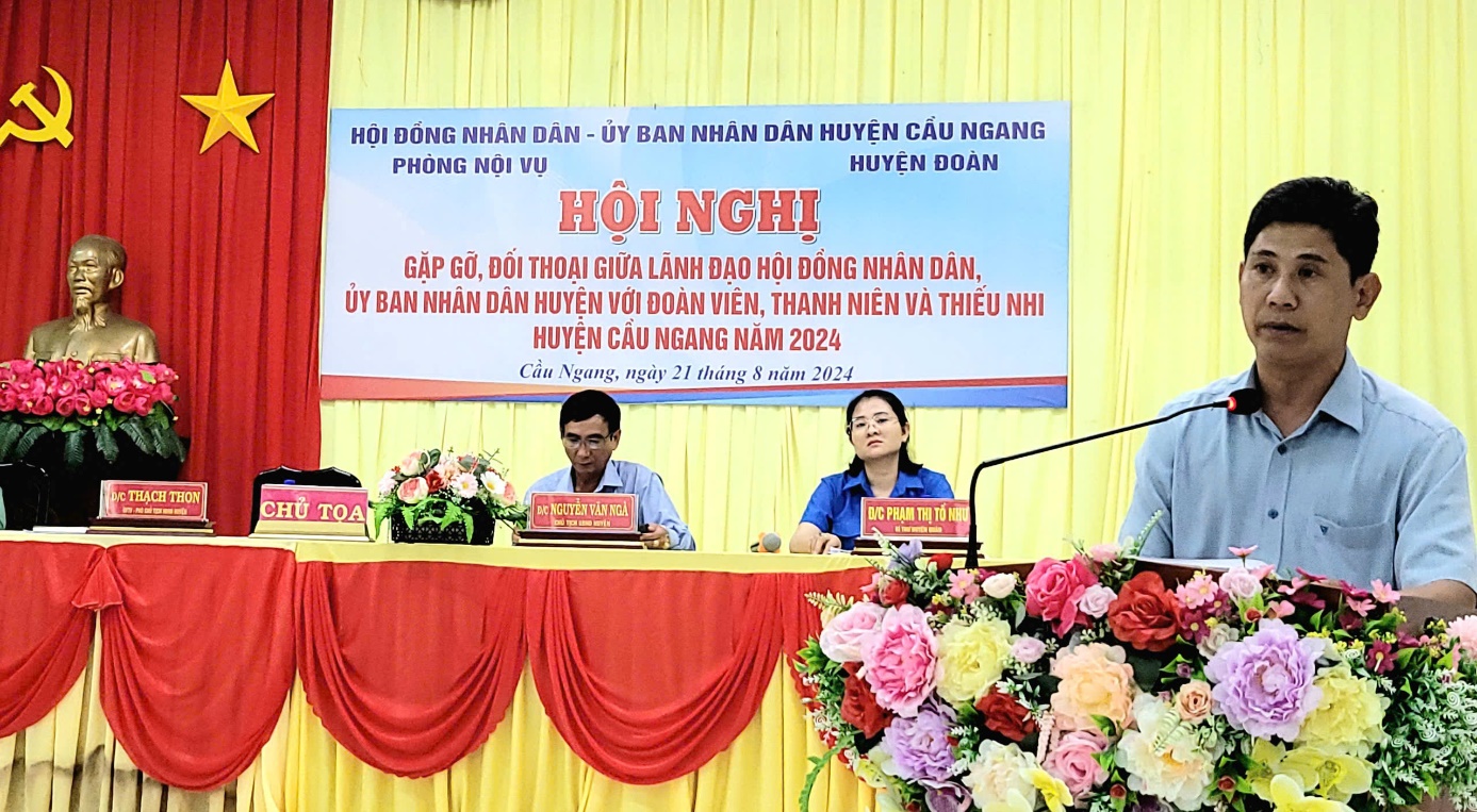 Ngày 21/8/2024, tại Hội trường Ủy ban nhân dân thị trấn Cầu Ngang, Huyện đoàn Cầu Ngang phối hợp Phòng Nội vụ tổ chức hội nghị gặp gỡ, đối thoại giữa lãnh đạo Hội đồng nhân dân, Ủy ban nhân dân huyện với đoàn viên, thanh niên và thiếu nhi năm 2024.
