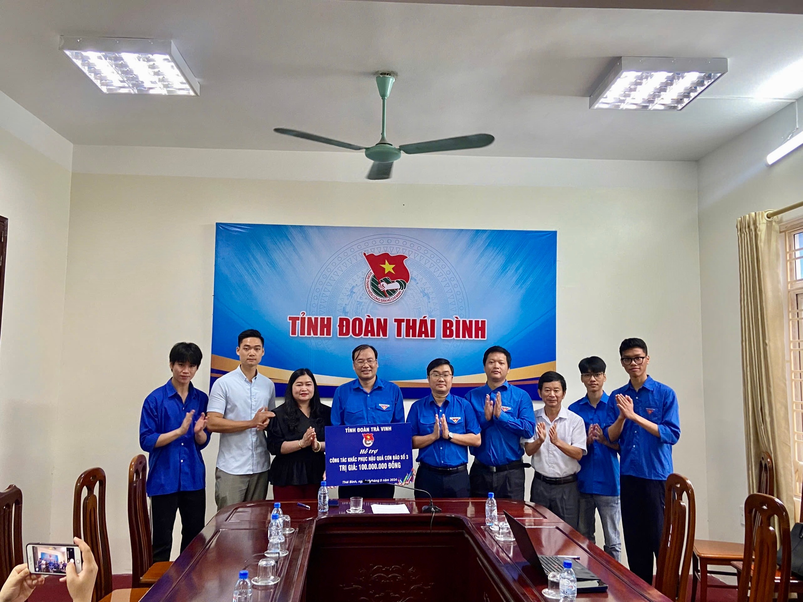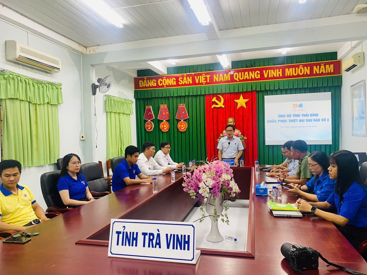 Tại buổi gặp gỡ, đại diện Tỉnh đoàn Thái Bình thông tin một số nội dung về tình hình hiện tại của tỉnh cũng như các hoạt động của đoàn viên, thanh niên trong công tác hỗ trợ người dân sau bão. Đồng chí Trần Trí Cường, Ủy viên Ban Chấp hành Trung ương Đoàn, Bí thư Tỉnh đoàn Trà Vinh đã gửi lời chia sẻ, thăm hỏi đến người dân những vùng bị ảnh hưởng nặng nề trên địa bàn tỉnh. Thay mặt tuổi trẻ Trà Vinh, Ban Thường vụ Tỉnh đoàn đã trao kinh phí ủng hộ 100 triệu đồng với mong muốn cùng với Đảng bộ, chính quyền và tuổi trẻ tỉnh Thái Bình khắc phục thiệt hại do cơn bão số 3 gây ra.