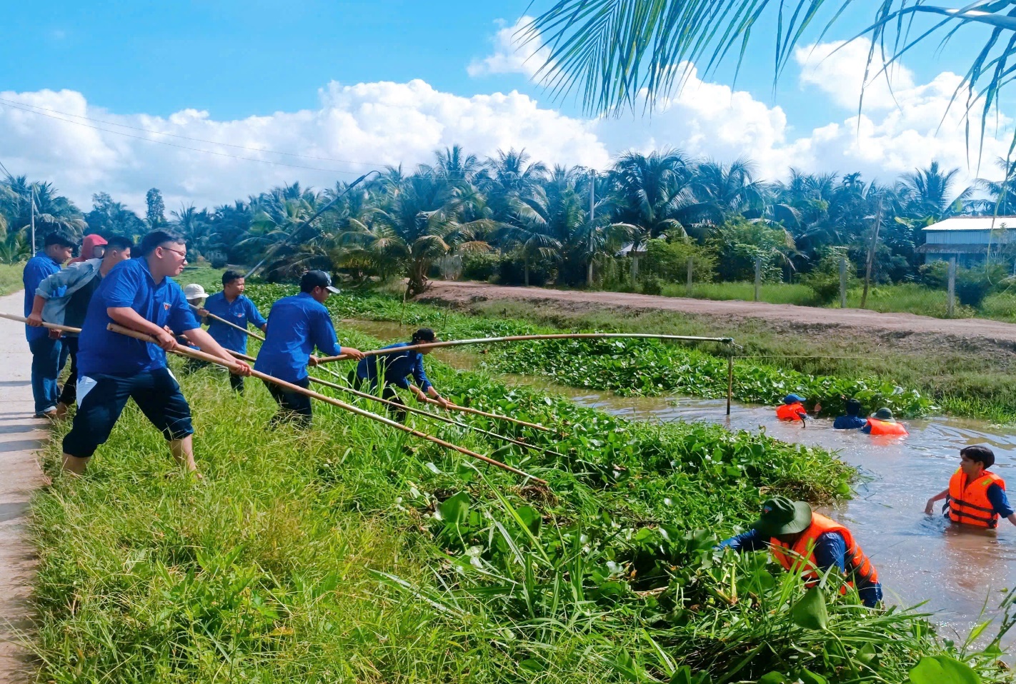 Đoàn viên, hội viên, thanh niên thực hiện vớt lục bình khơi thông dòng chảy tại tuyến kên N32 ấp Công Thiện Hùng, xã Long Đức