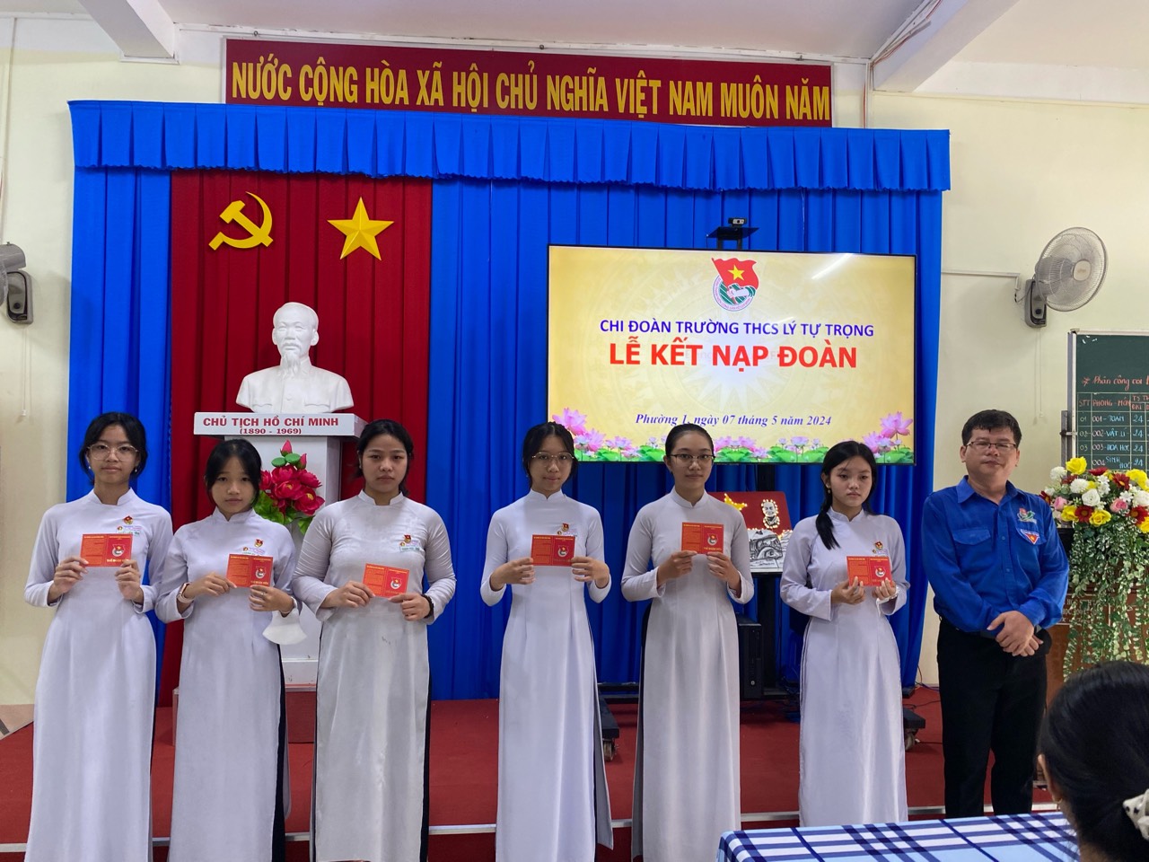 | Đồng chí Huỳnh Huệ Minh trong lễ Kết nạp Đoàn tại trường THCS Lý Tự Trọng |