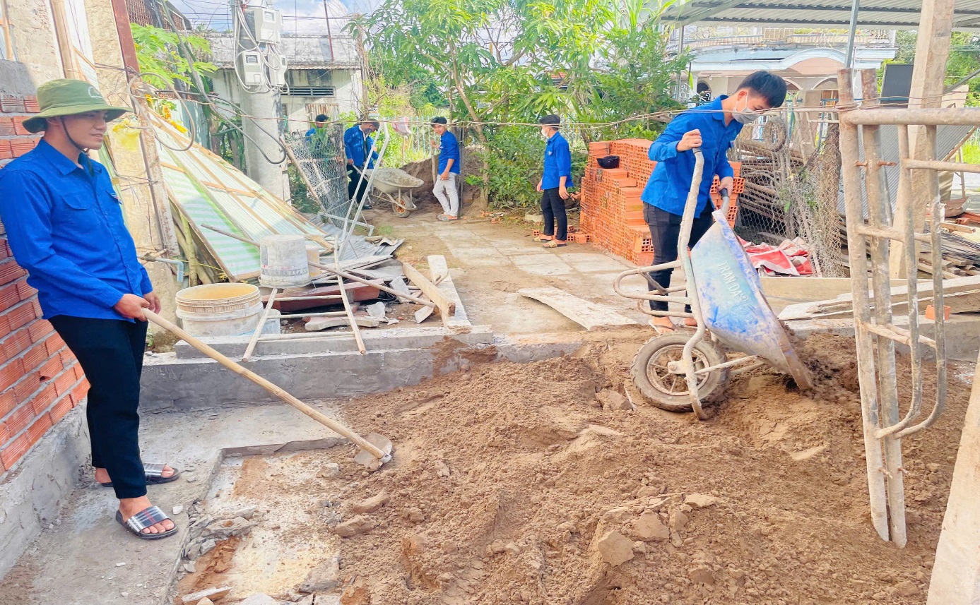 Đoàn viên, thanh niên tham gia hỗ trợ xây dựng nhà cho hộ dân ấp Cà Tum B, xã Vinh Kim, huyện Cầu Ngang