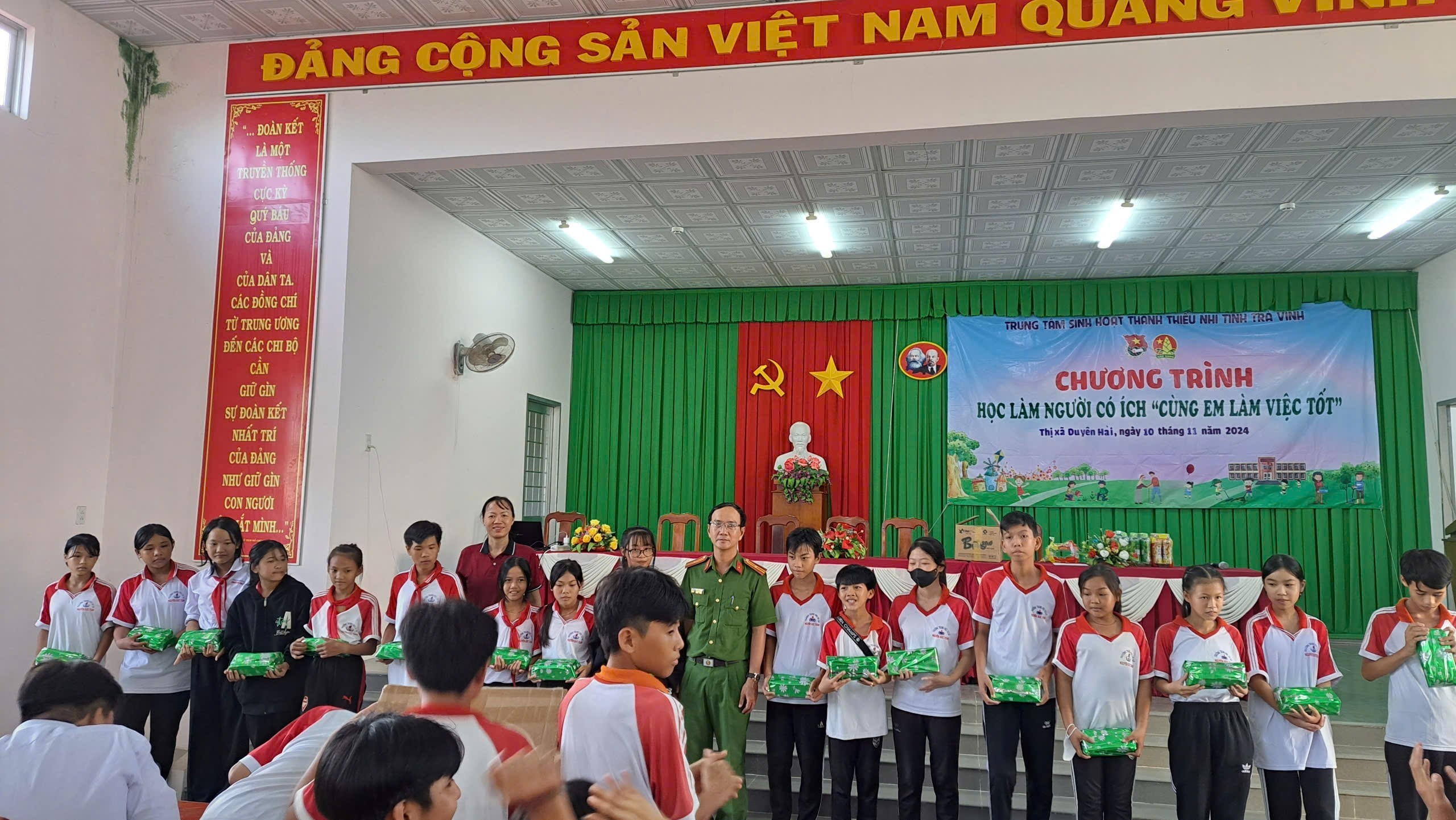 Với mục đích đa dạng hoá các hoạt động hỗ trợ, giúp đỡ các em có hoàn cảnh khó khăn, Ban Thường vụ Tỉnh đoàn chỉ đạo Trung tâm Sinh hoạt Thanh thiếu nhi tỉnh tổ chức chương trình “Học làm người có ích” năm 2024 – chủ đề “Cùng em làm việc tốt”. Kết quả, đã tổ chức được 03 kỳ ở xã Nhị Trường (huyện Cầu Ngang); xã Trường Long Hòa và xã Long Hữu (Thị xã Duyên Hải) với hơn 250 em đội viên, thiếu nhi tham gia.