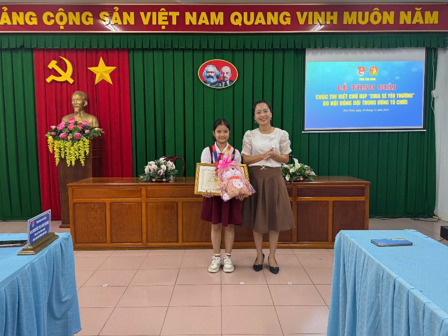 Đồng chí Dương Thị Yến Nhi, Ủy viên Ban Thường vụ, Trưởng Ban Thanh thiếu nhi – Trường học Tỉnh đoàn trao Bằng khen của Hội đồng Đội Trung ương, thư khen và phần quà của Tỉnh đoàn cho em Nguyễn Ngọc Lan Anh, lớp 4B, Trường thực hành Sư phạm, thành phố Trà Vinh đạt giải Khuyến khích trong sân chơi Cuộc thi viết chữ đẹp