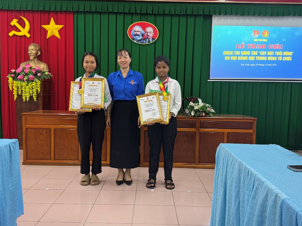 Đồng chí Nguyễn Thu Hà, Phó Chủ tịch Hội đồng Đội tỉnh, Phó Giám đốc Trung tâm Sinh hoạt Thanh thiếu nhi tỉnh trao Giấy chứng nhận của Hội đồng Hội Trung ương, thư khen và phần quà của Tỉnh đoàn cho em Ngô Thị Hoàn Nguyên, lớp 7B, trường Trung học cơ sở Châu Điền, em Nguyễn Đặng Tuyết Thảo, lớp 8B, trường Trung học cơ sở An Phú Tân, huyện Cầu Kè và em Sơn Thị Hồng Thắm, lớp 9/1, trường Trung học cơ sở Trương Văn Trì, huyện Châu Thành đạt giải Triển vọng trong Cuộc thi Cây bút tuổi hồng