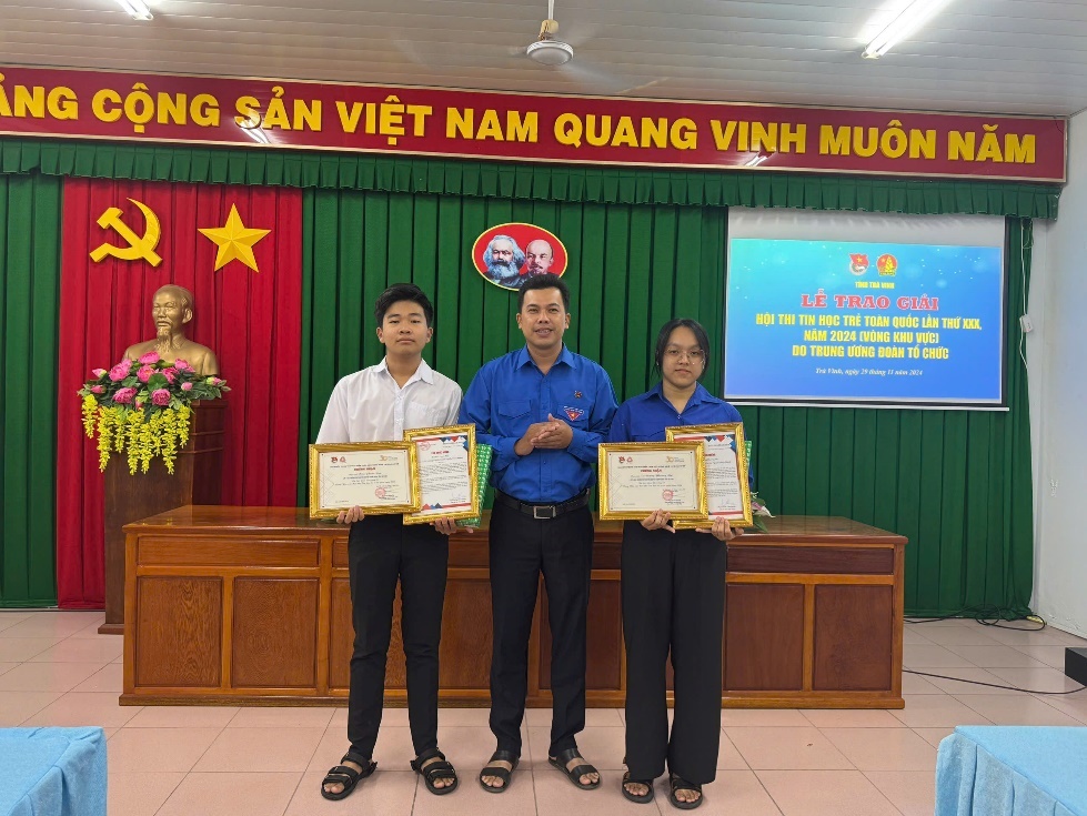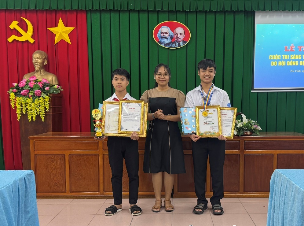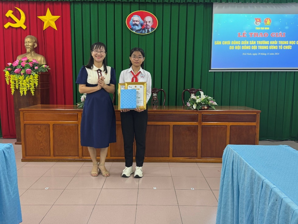 Đồng chí Thạch Thị Diễm Kiều, Ủy viên Ban Chấp hành, Quyền Trưởng Ban Phong trào Tỉnh đoàn trao Giấy chứng nhận của Hội đồng Hội Trung ương, thư khen và phần quà của Tỉnh đoàn cho em Đặng Khánh Tường, lớp7/2, trường Trung học cơ sở Nguyễn Văn Cống, huyện Cầu Ngang đạt giải Khuyến khích sân chơi Bảo vệ môi trường và em Lâm Phú Quý, lớp 9.3, trường Trung học cơ sở Chu Văn An, thị xã Duyên Hải, đạt giải Triển vọng trong sân chơi Bảo vệ môi trường