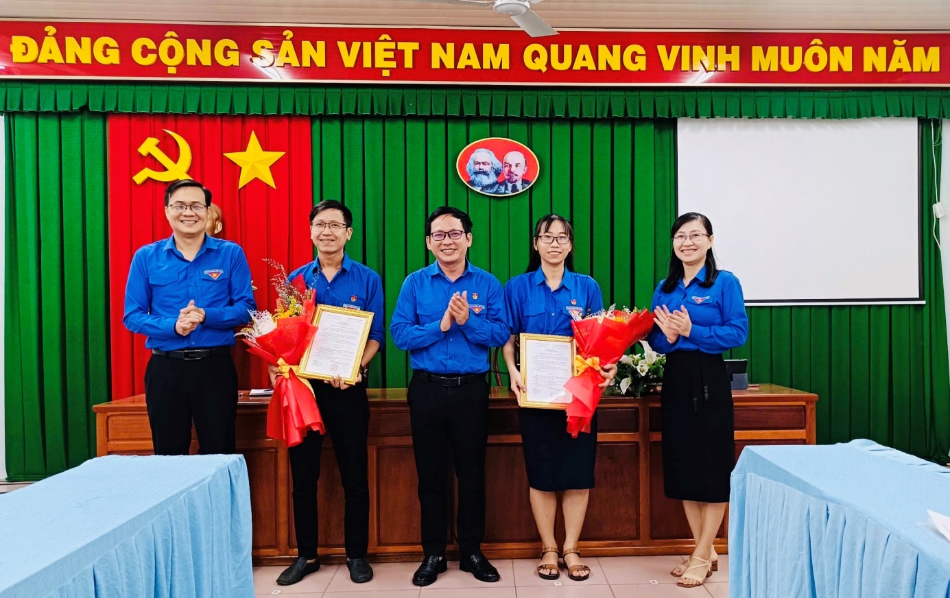 Đồng chí Trần Trí Cường, Ủy viên Ban Chấp hành Trung ương Đoàn, Bí thư Tỉnh đoàn; đồng chí Nguyễn Thanh Nhã, Phó Bí thư Thường trực Tỉnh đoàn, đồng chí Nguyễn Thị Cẩm Hương, Phó Bí thư Tỉnh đoàn trao Quyết định và hoa cho 02 đồng chí tân Phó trưởng ban