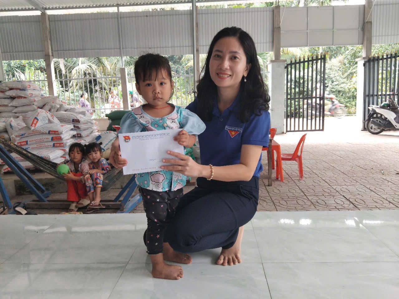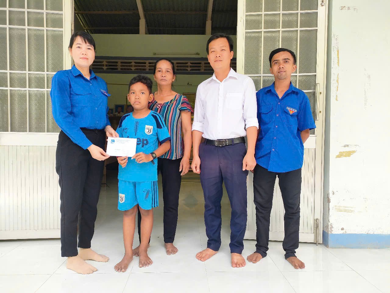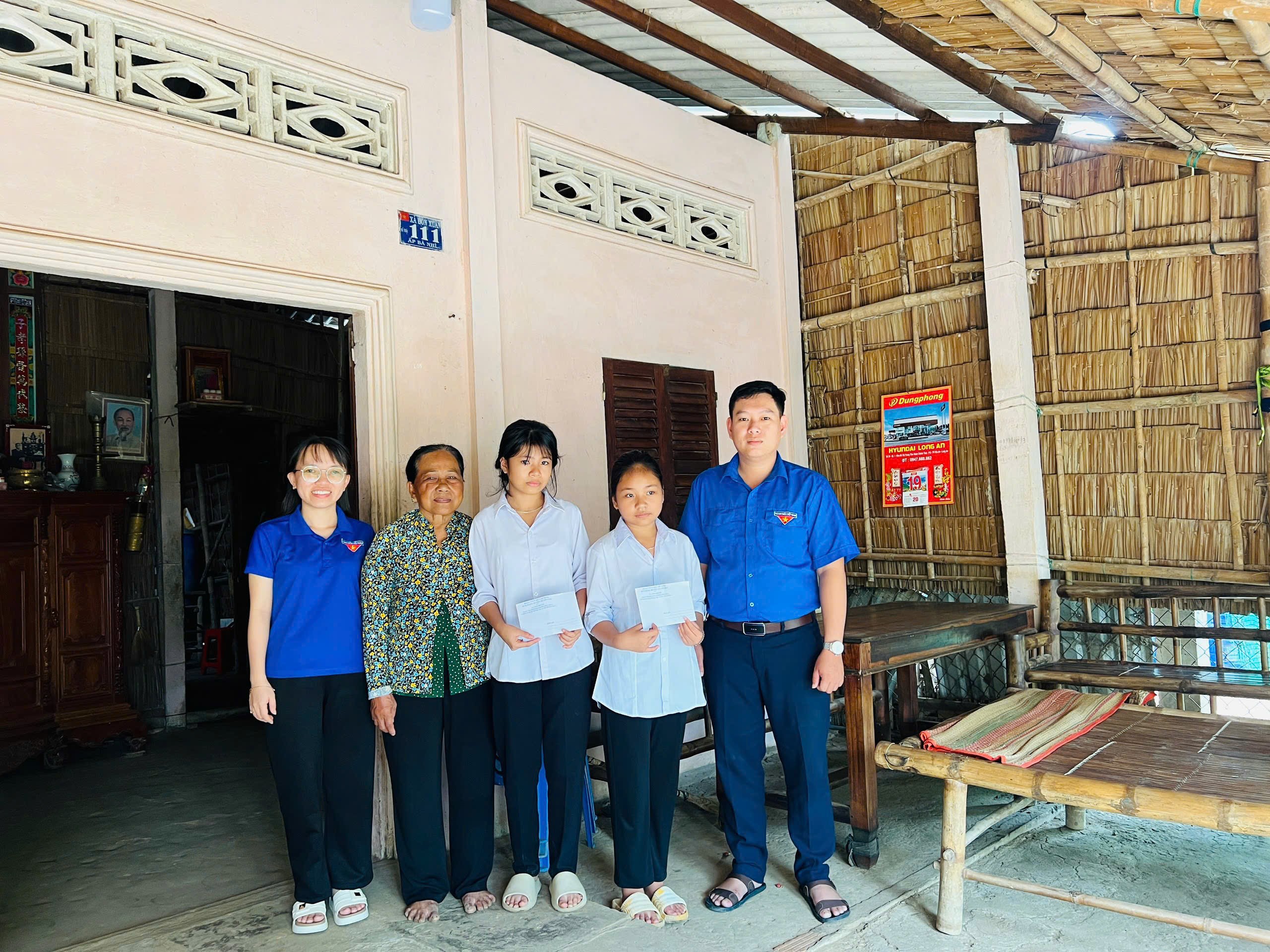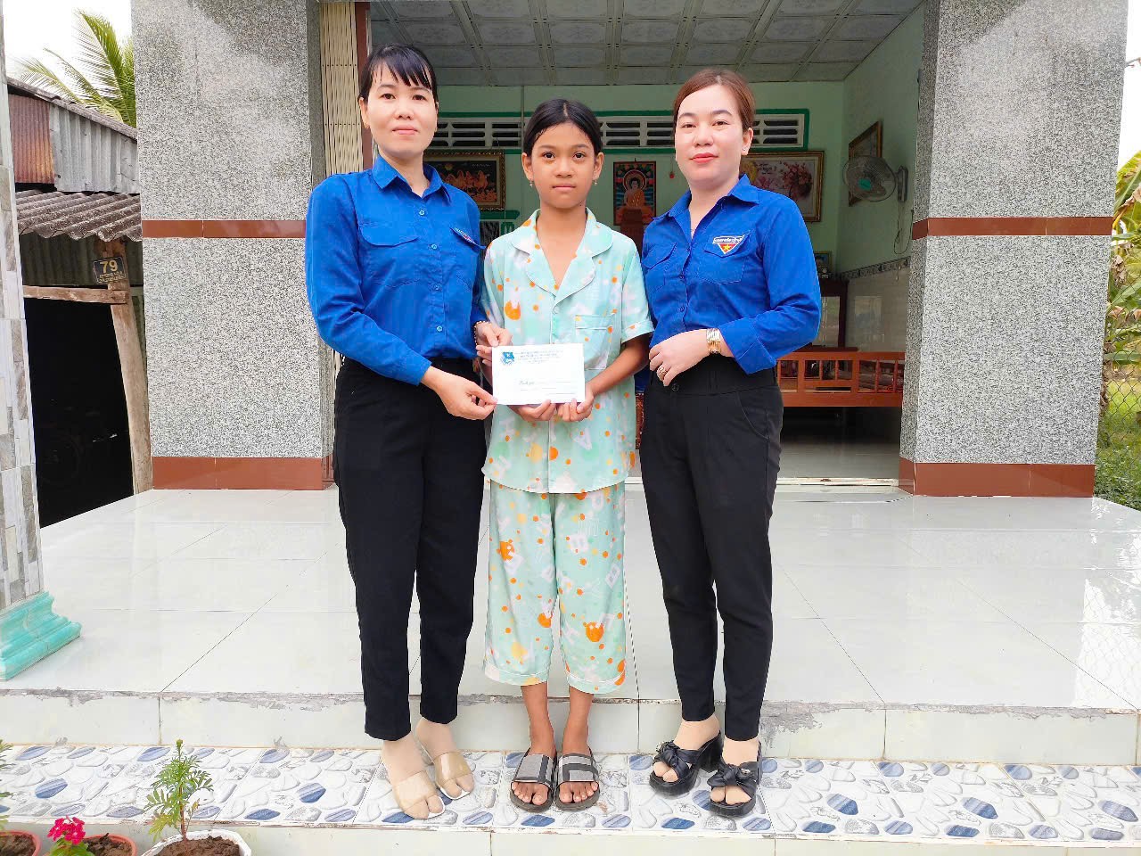 Đồng chí Nguyễn Thị Thúy Huỳnh, Phó Bí thư Huyện đoàn Cầu Kè trao học bổng các em trên địa bàn huyện Cầu Kè