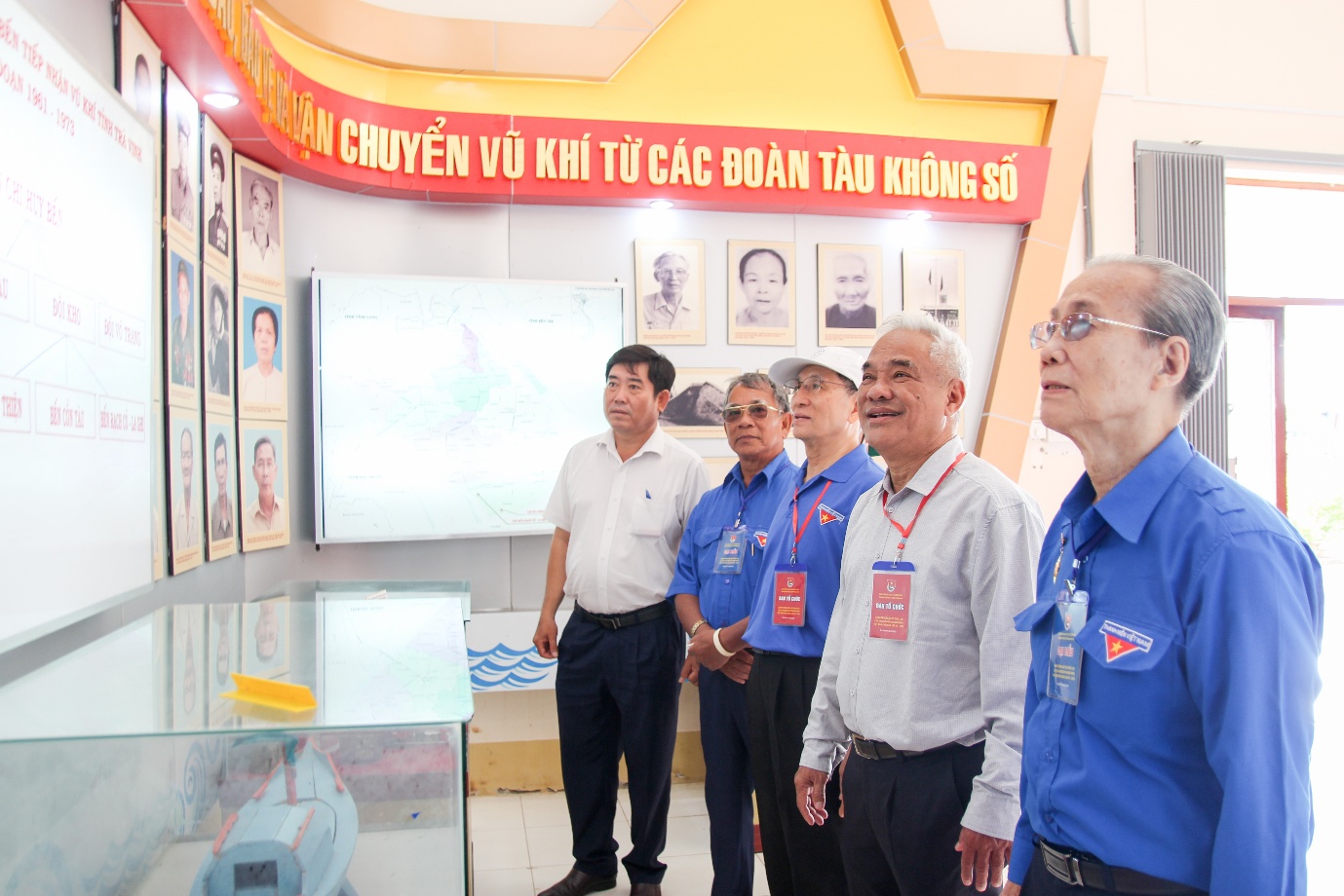 Đồng chí Dương Văn Triệu (bìa trái), Bí thư Thị ủy Duyên Hải và Tiến sĩ Lê Hồng Liêm (thứ 2 từ phải sang), Trưởng Ban Liên lạc cựu cán bộ Đoàn Thanh niên Việt Nam khu vực phía Nam cùng đại biểu tham qua nhà trưng bày Khu di tích Bến tiếp nhận vũ khí Cồn Tàu