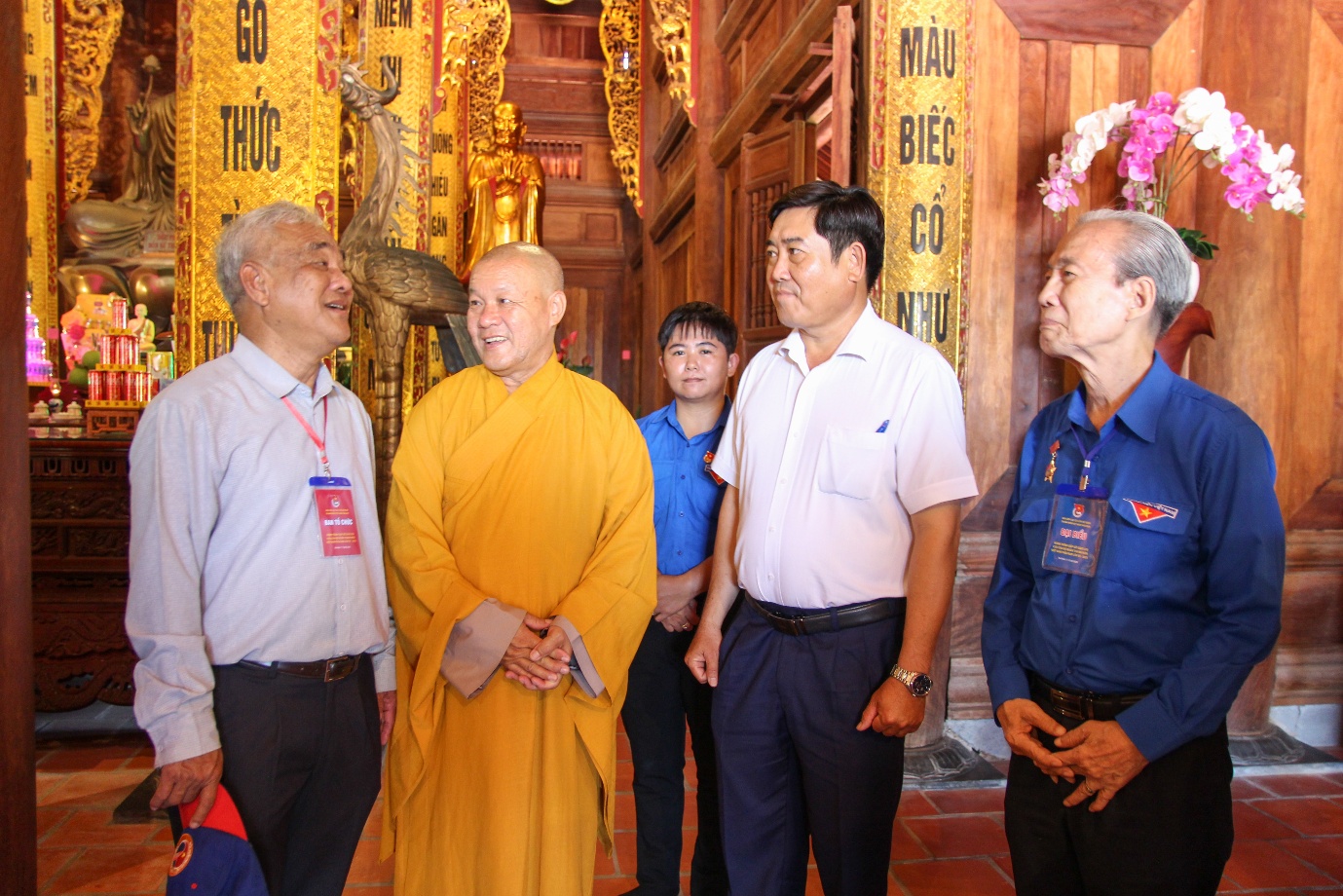 Đồng chí Dương Văn Triệu (thứ 2 từ phải sang), Bí thư Thị ủy Duyên Hải và Tiến sĩ Lê Hồng Liêm (bìa trái), Trưởng Ban Liên lạc cựu cán bộ Đoàn Thanh niên Việt Nam khu vực phía Nam trao đổi với thượng tọa Thích Phước Nguyên, Trụ trì Thiền viện Trúc Lâm Trà Vinh
