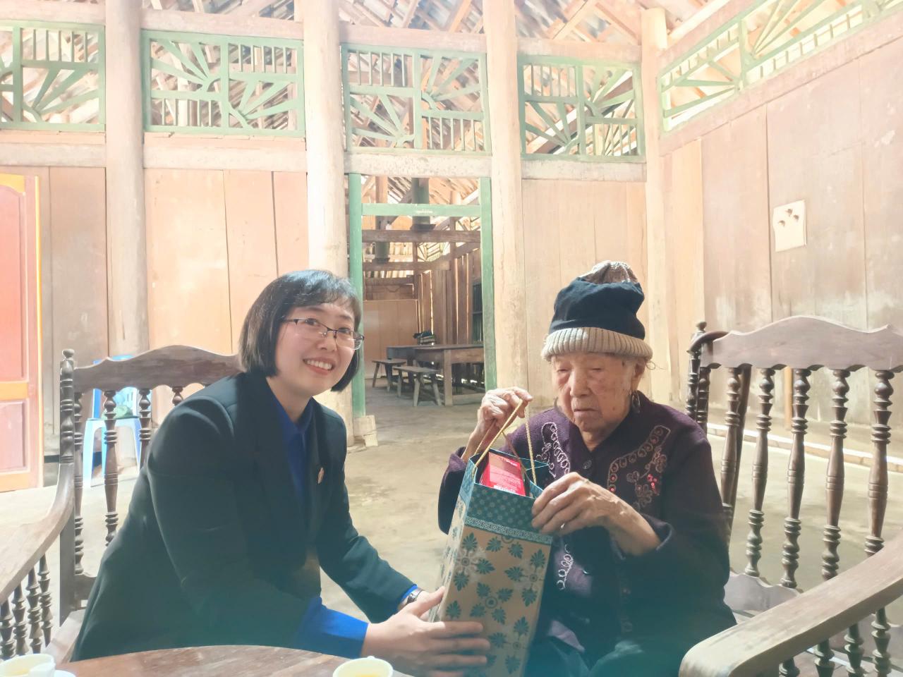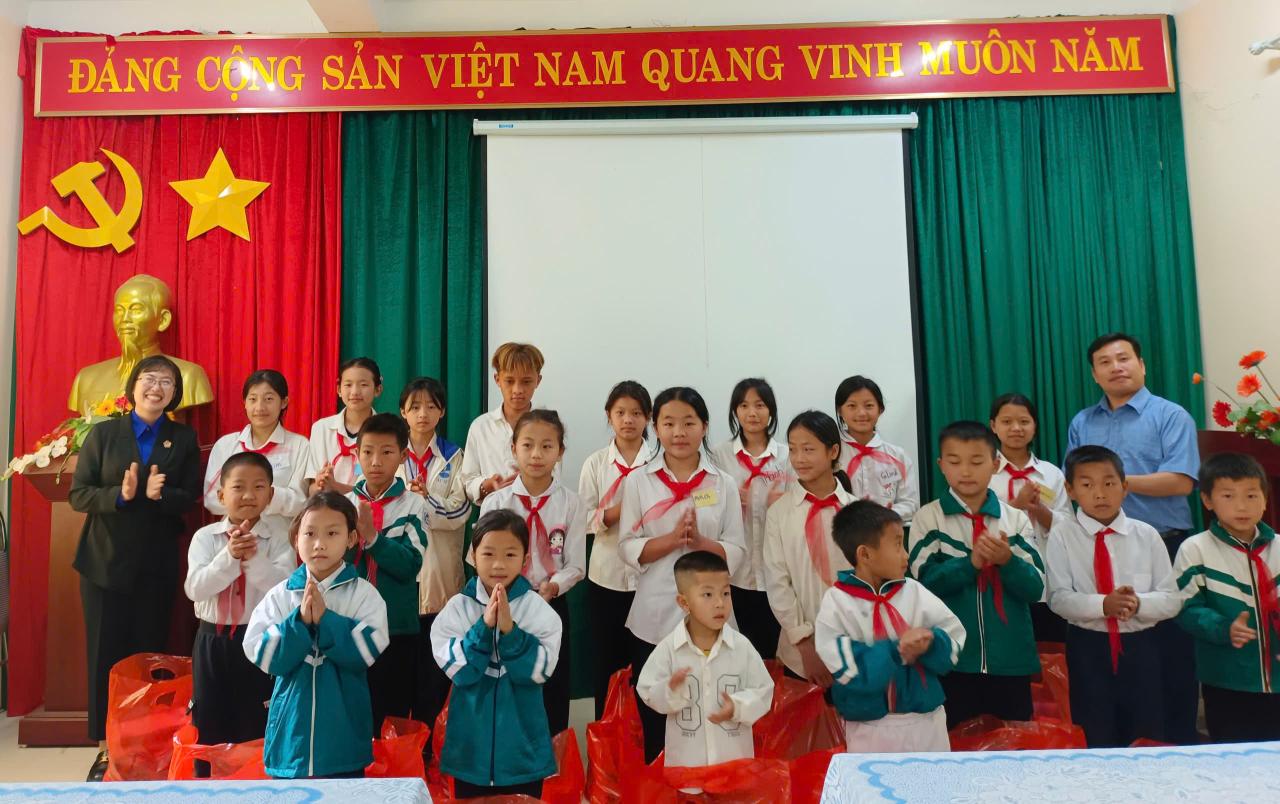 Đồng chí Kháng Mai Thu, Phó Bí thư Tỉnh đoàn, Chủ tịch Hội đồng Đội tỉnh Điện Biên trao tặng quà cho các em học sinh có hoàn cảnh khó khăn vươn lên trong học tập trên địa bàn xã Pú Nhung.
