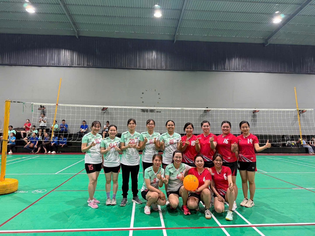 Đội bóng chuyền hơi nữ Cơ quan Tỉnh đoàn chụp ảnh lưu niệm cùng đội bóng chuyền hơi nữ huyện Cầu Kè