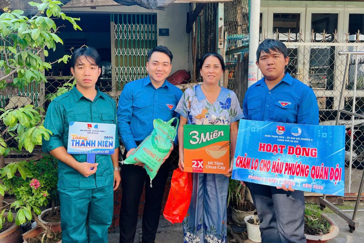Đồng chí Ngô Văn Quí (thứ 2 từ trái qua) cùng thanh niên trong CLB Tình nguyện trẻ thành phố Sa Đéc thăm, tặng quà cho người nhà các thanh niên lên đường nhập ngũ năm 2025