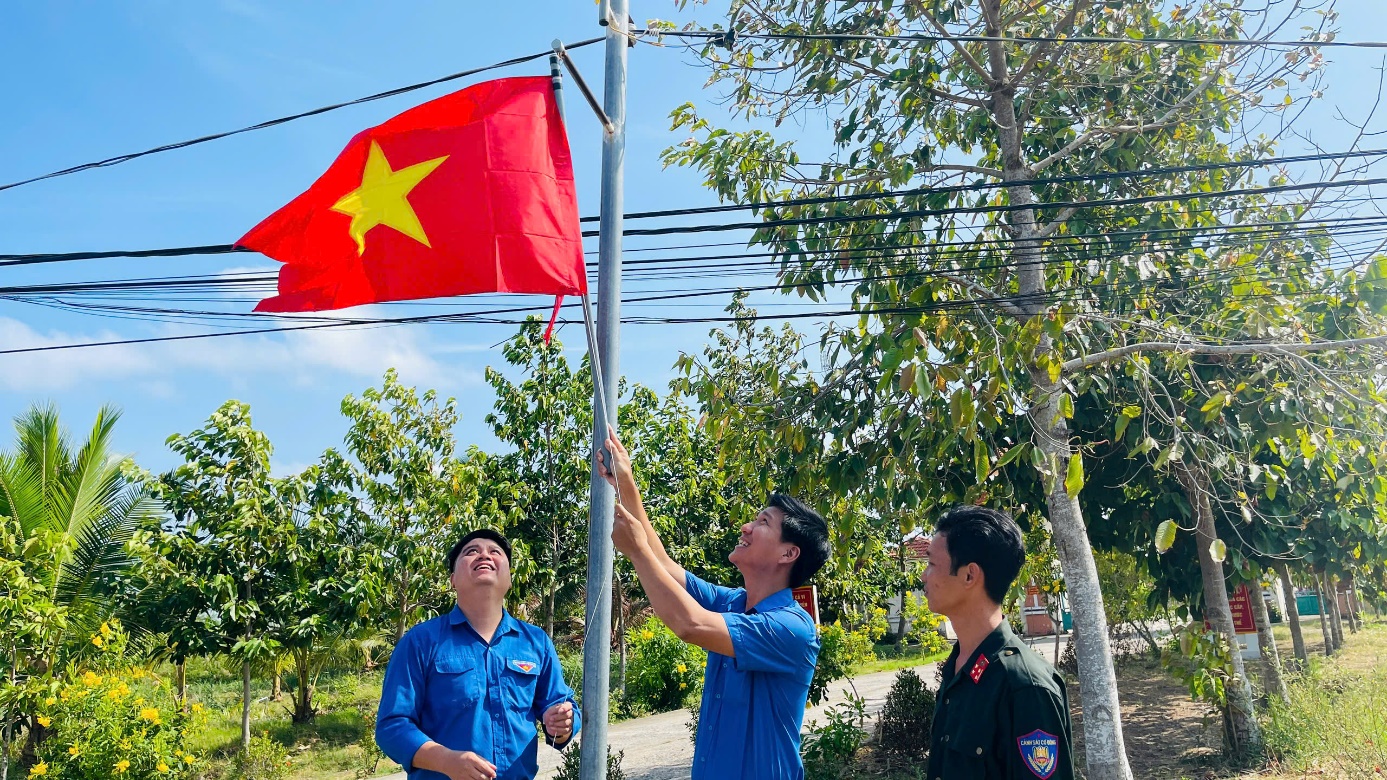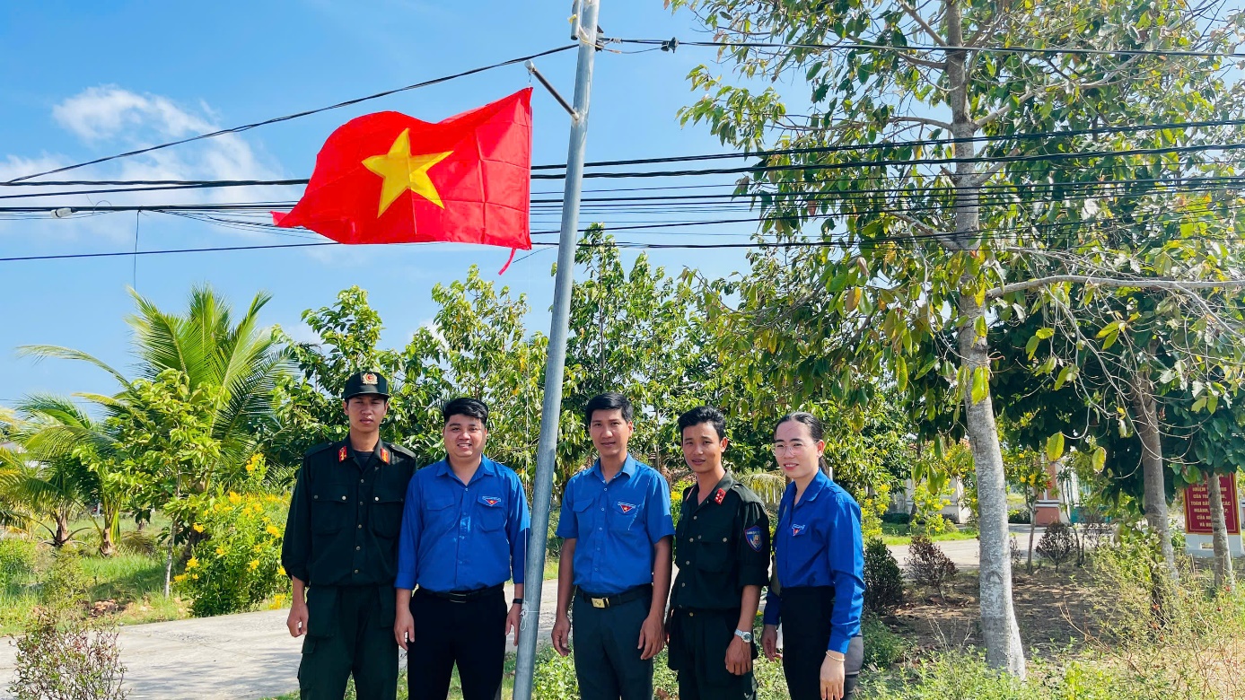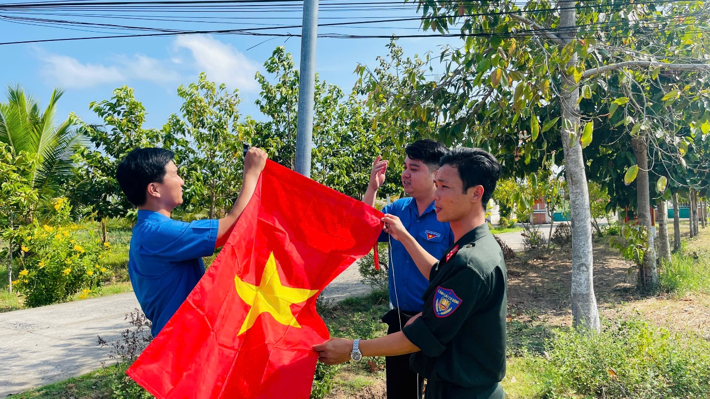 Đồng chí Trang Văn Thẳng, Phó Bí thư Huyện đoàn Tiểu Cần; đồng chí Lê Khánh Tiên, Phó Chủ tịch Hội LHTN Việt Nam huyện Châu Thành trao tặng Công trình “Đường cờ Tổ quốc”