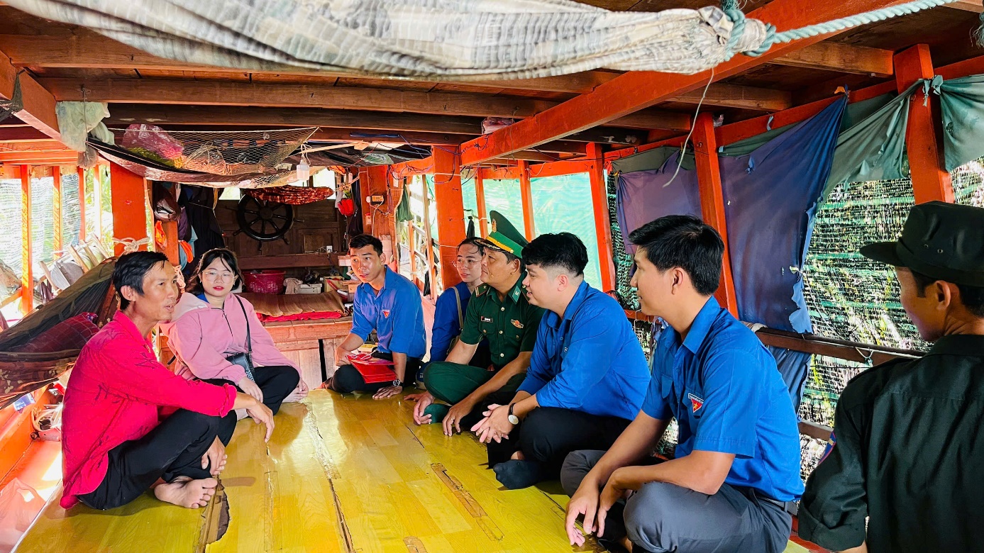 Thiếu ta Kiên Minh Tâm, Chính trị viên phó Đồn Biên phòng Long Hòa tuyên truyền biển, đảo cho hội viên, thanh niên