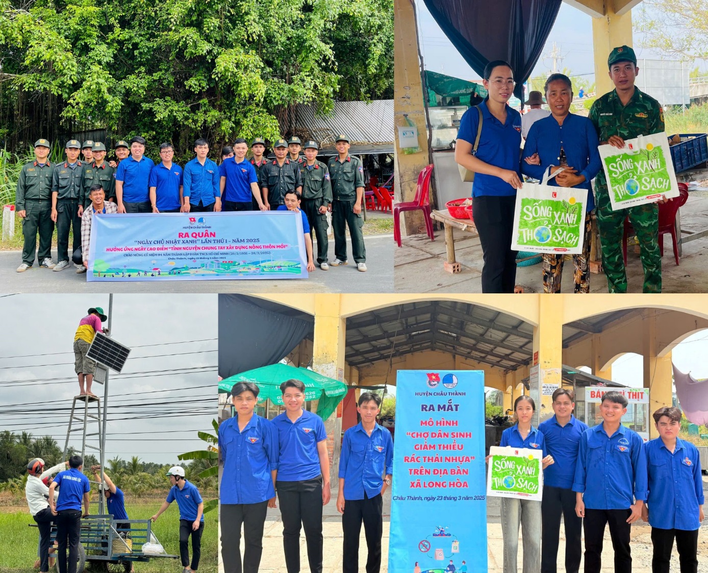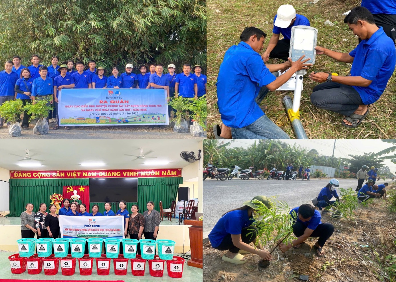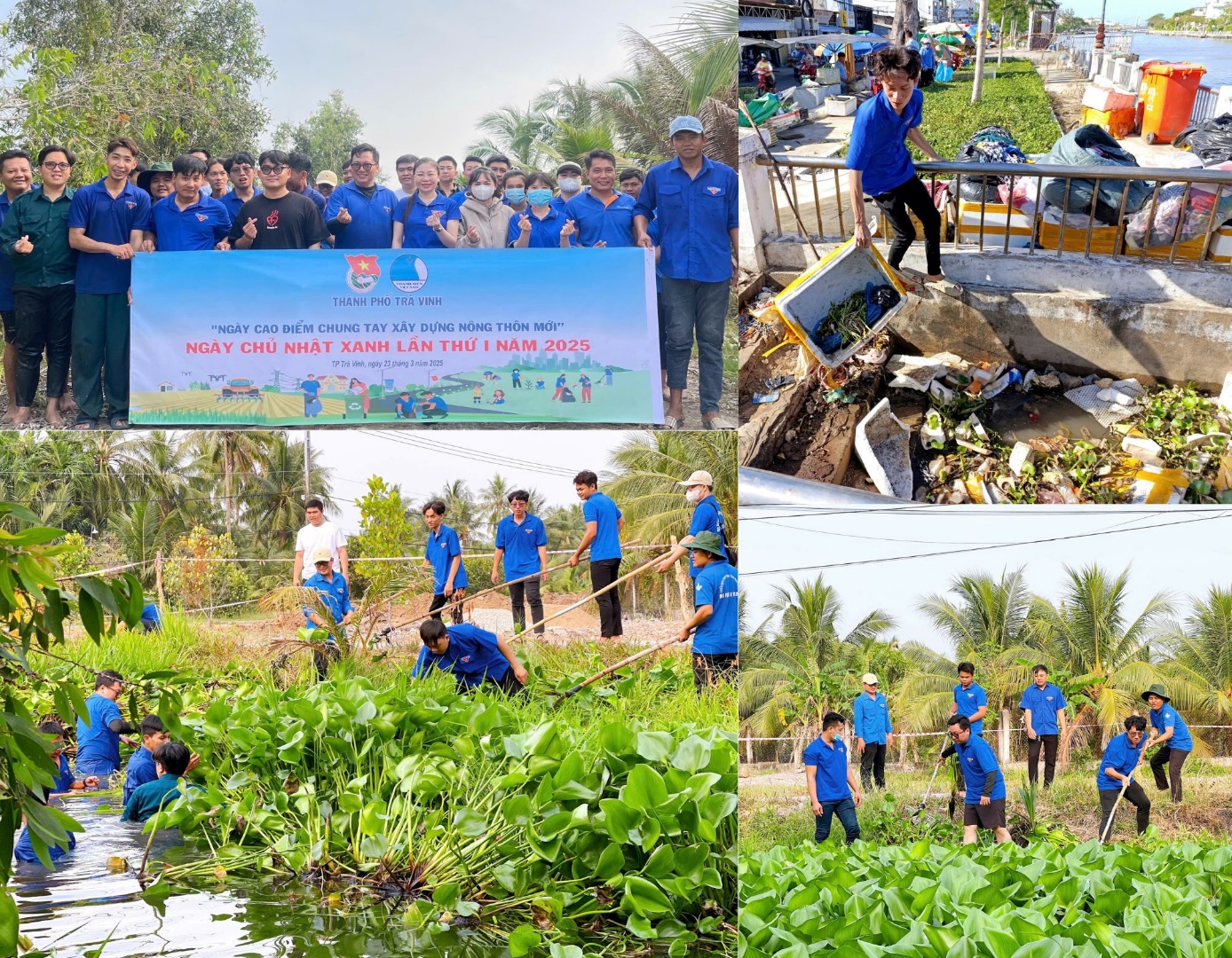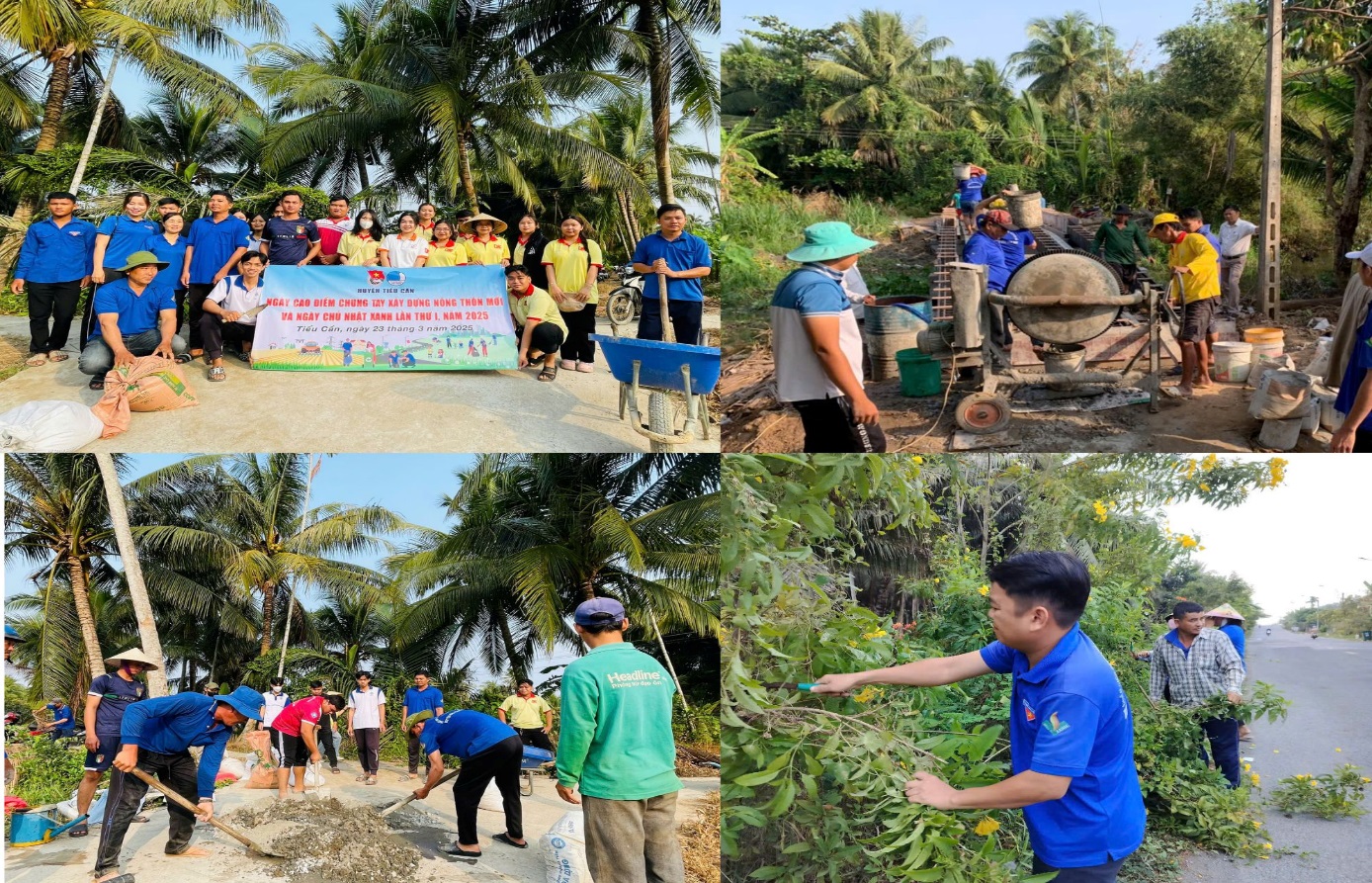 Cùng ngày, 100% các cơ sở Đoàn trong toàn tỉnh đã đồng loạt triển khai các hoạt động hưởng ứng Ngày cao điểm “Tình nguyện chung tay xây dựng nông thôn mới”“Ngày chủ nhật xanh” đợt 1, có hơn 3.500 đoàn viên, thanh niên trong toàn tỉnh tham gia. Các hoạt động trong Ngày cao điểm được triển khai thực hiện như: Tổ chức trồng 4.550 cây xanh ở các khu vực công cộng, khu dân cư; tổ chức thu gom hơn 2.7 tấn rác thải; phát quang và vệ sinh các tuyến đường sáng – xanh – sạch -đẹp, tuyến đường thanh niên tự quản với chiều dài 63.5km; ra mắt 03 mô hình hưởng ứng phong trào Phòng, chống rác thải nhựa:“Thu gom xử lý rác thải nhựa trên địa bàn dân cư”, phát 30 túi nhựa cho người dân, lắp 30 pano tuyên truyền và phát 200 tờ rơi về bảo vệ môi trường; thực hiện phong trào “Tuổi trẻ Trà Vinh chung tay bảo vệ môi trường, bảo vệ dòng sông quê hương” vớt lục bình, khơi thông dòng chảy tại các tuyến kênh, sông với chiều dài 7.5km; ngoài ra đoàn viên thanh niên thực hiện 02 công trình thắp sáng đường quê với chiều dài 3km, sửa chữa 2km đường giao thông nông thôn; xây dựng 01 cầu giao thông nông thôn; hướng dẫn cho 50 hộ dân sử dụng App thanh toán điện tử, sử dụng hệ thống hành chính công trực tuyến. Tổng kinh phí thực hiện các công trình, phần việc gần 200 triệu đồng.