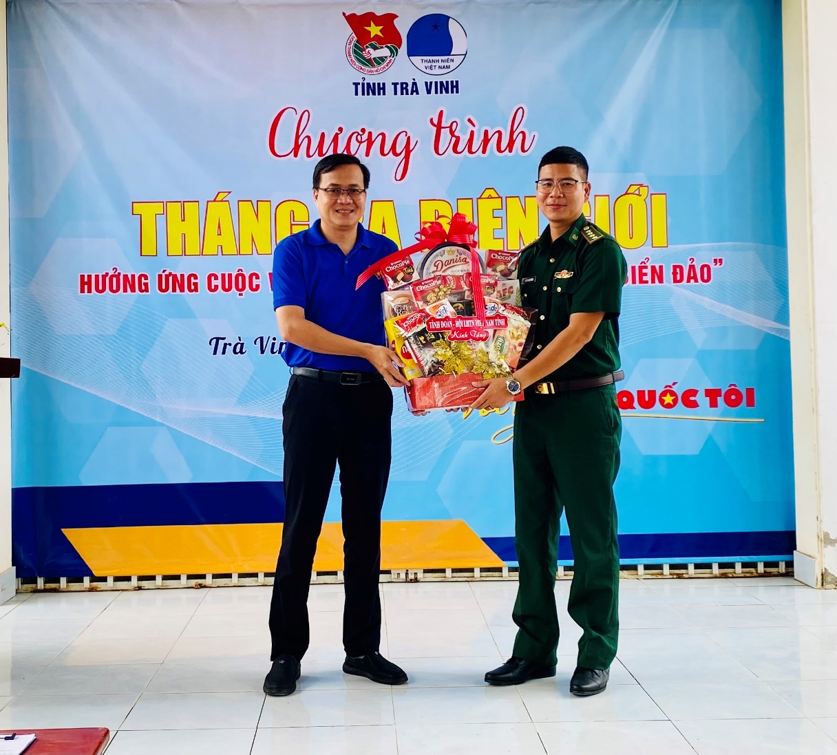 Đồng chí Nguyễn Thanh Nhã, Phó Bí thư Thường trực Tỉnh đoàn, Chủ tịch Hội LHTN Việt Nam tặng quà chúc mừng cán bộ, chiến sĩ Đồn Biên phòng Long Vĩnh
