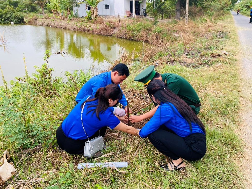 Cán bộ, chiến sỹ biên phòng và đoàn viên thanh niên tiến hành trồng mới cây xanh