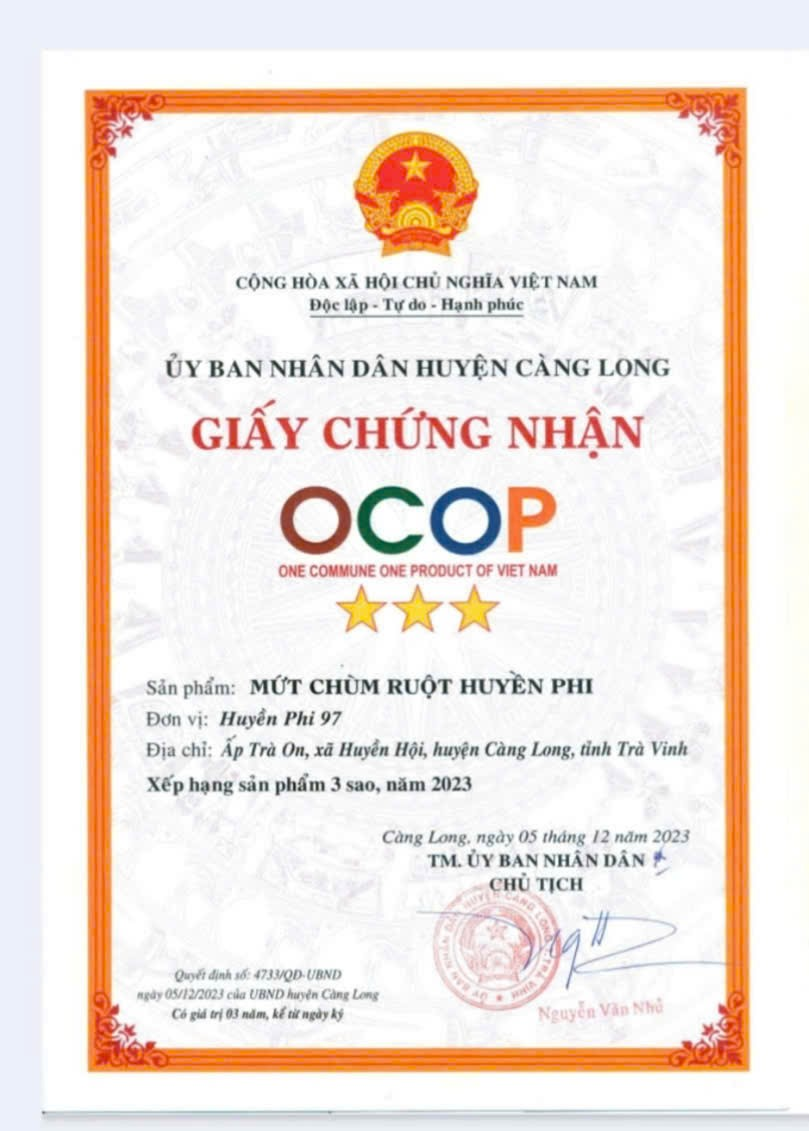 Bằng sự nổ lực, cố gắng, năm 2023 sản phẩm mứt chùm ruột Huyền Phi đã được công nhận là sản phẩm OCOP đạt hạng 03 sao theo Quyết định số 473/QĐ-UBND, ngày 05/12/2023 của Uỷ ban nhân dân huyện Càng Long.