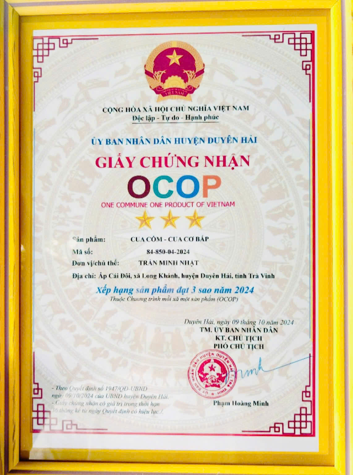 Huyện Duyên Hải, tỉnh Trà Vinh là vùng đất ven biển giàu tiềm năng nuôi trồng thủy sản, trong đó nổi bật là sản phẩm Cua Cốm – Cua Cơ Bắp, một đặc sản quý hiếm được người tiêu dùng đánh giá cao về chất lượng dinh dưỡng cũng như hương vị đặc trưng. Tham gia chương trình OCOP, cua cốm đã trở thành sản phẩm tiêu biểu, góp phần nâng tầm thương hiệu nông sản địa phương trên thị trường.
