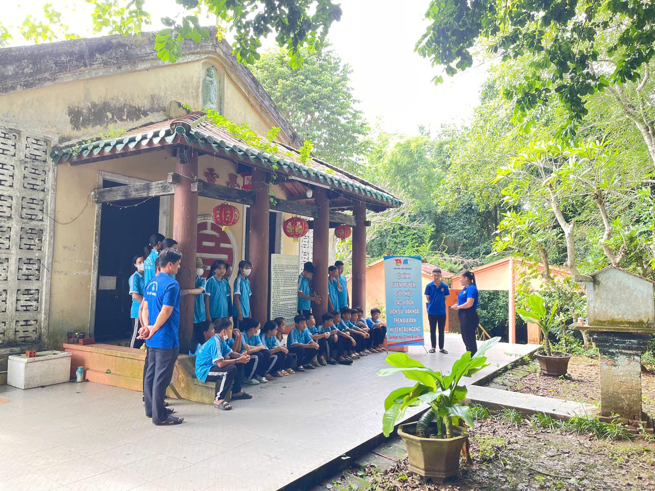 Hình 3: ĐVTN, học sinh tham quan, nghe thuyết trình, giới thiệu về di tích Chùa Giác Linh