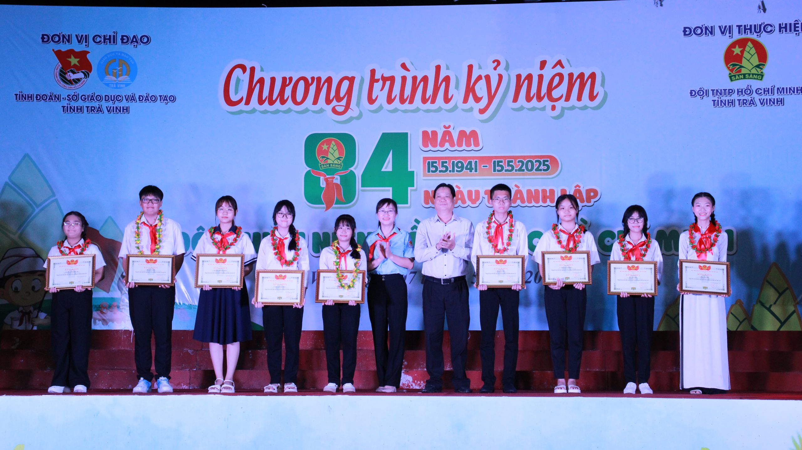 Đồng chí Châu Chí Công Phó Trương Ban Tuyên giáo và Dân Vận Tỉnh ủy cùng đồng chí Nguyễn Thị Cẩm Hương, Phó Bí thư Tỉnh đoàn, Chủ tịch Hội đồng Đội tỉnh trao tuyên dương các em Đội viên tiêu biểu