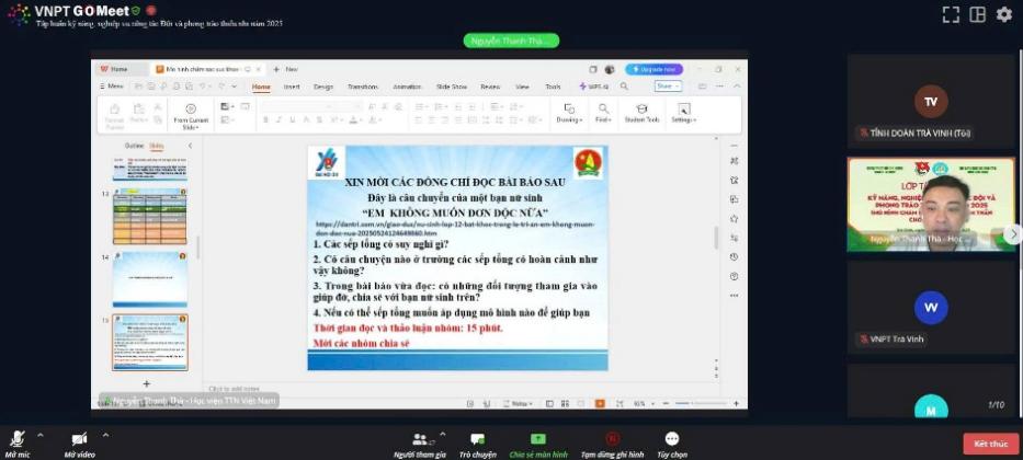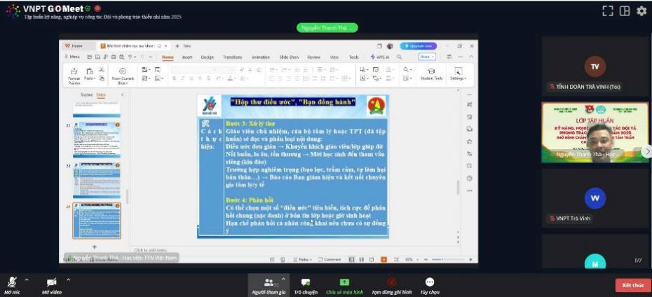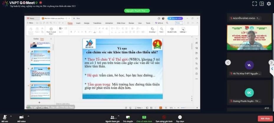 Với mục tiêu nhằm nâng cao hiệu quả và chia sẻ các mô hình hay về chăm sóc sức khỏe tâm thần cho thiếu nhi, chiều ngày 29/5/2025, Ban Thường vụ Tỉnh đoàn phối hợp cùng Sở Giáo dục và Đào tạo tổ chức tập huấn chuyên đề “mô hình chăm sóc sức khỏe tâm thần cho thiếu nhi” thông qua hình thức trực tuyến, có 54 giáo viên làm Tổng phụ trách Đội của các trường Tiểu học và THCS trên địa bàn tỉnh tham gia.