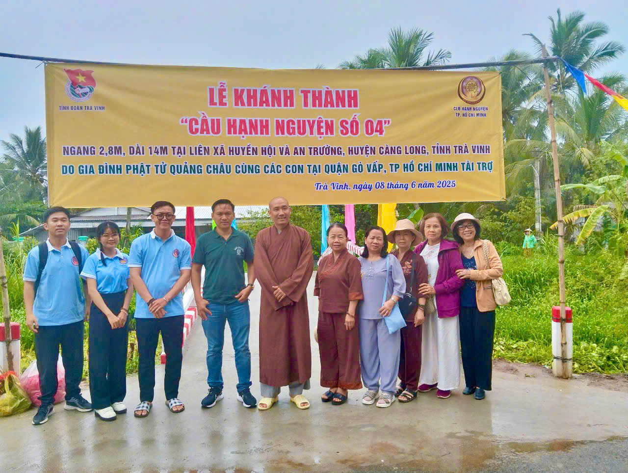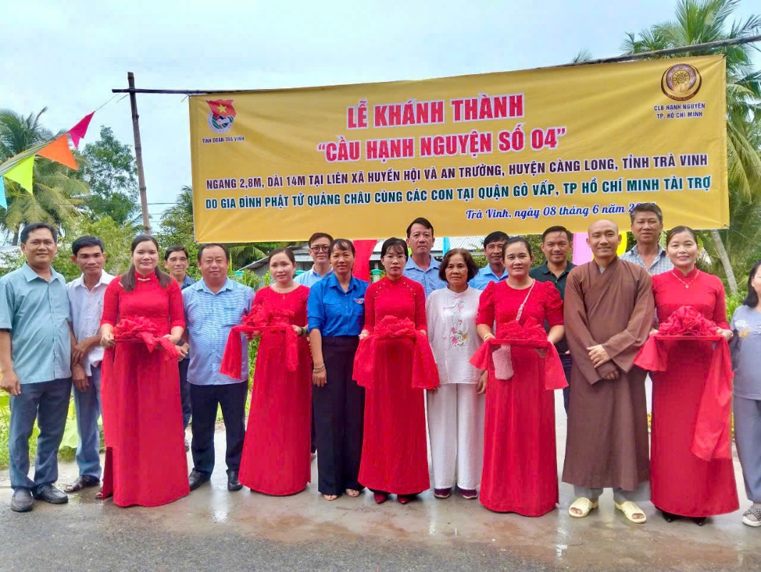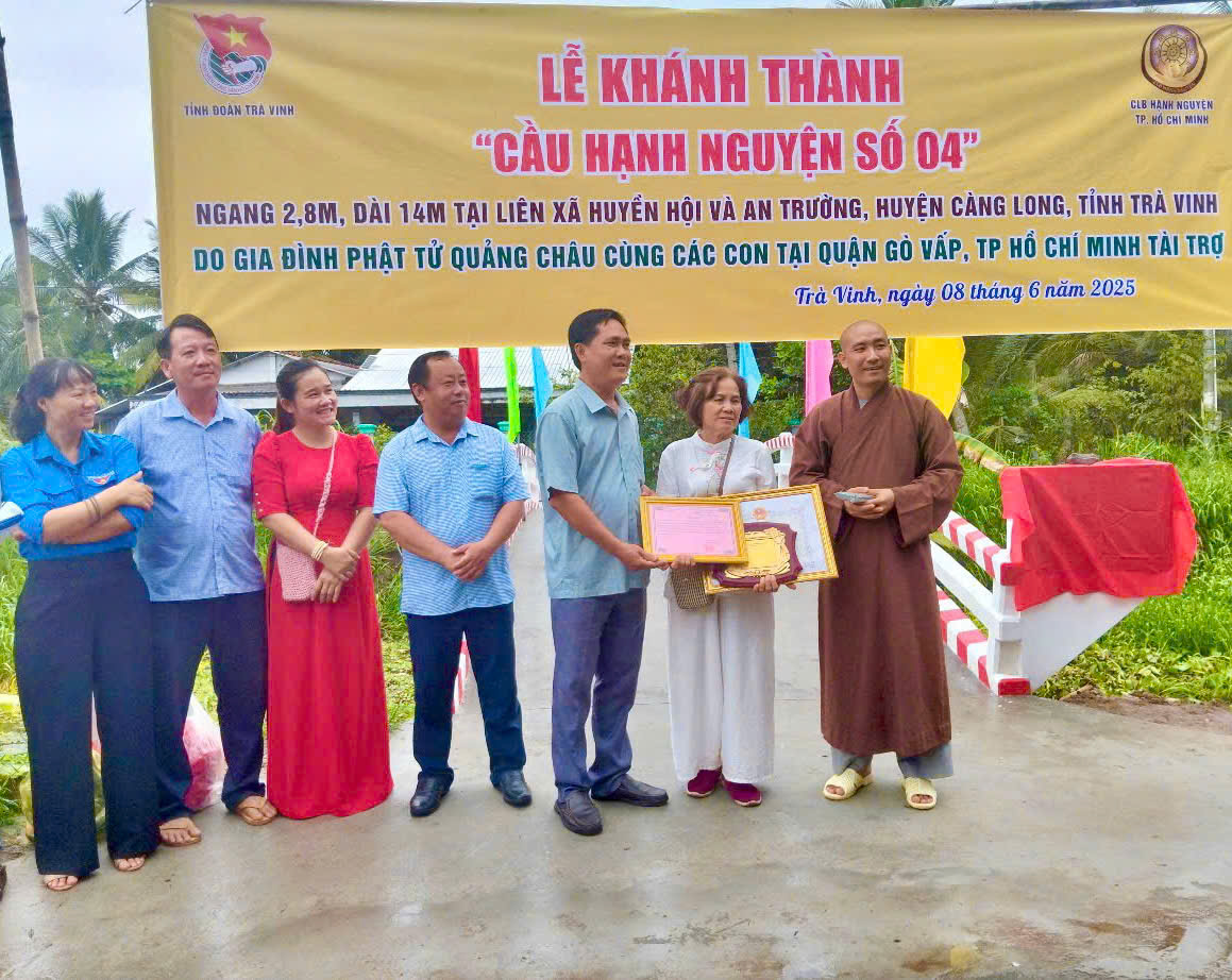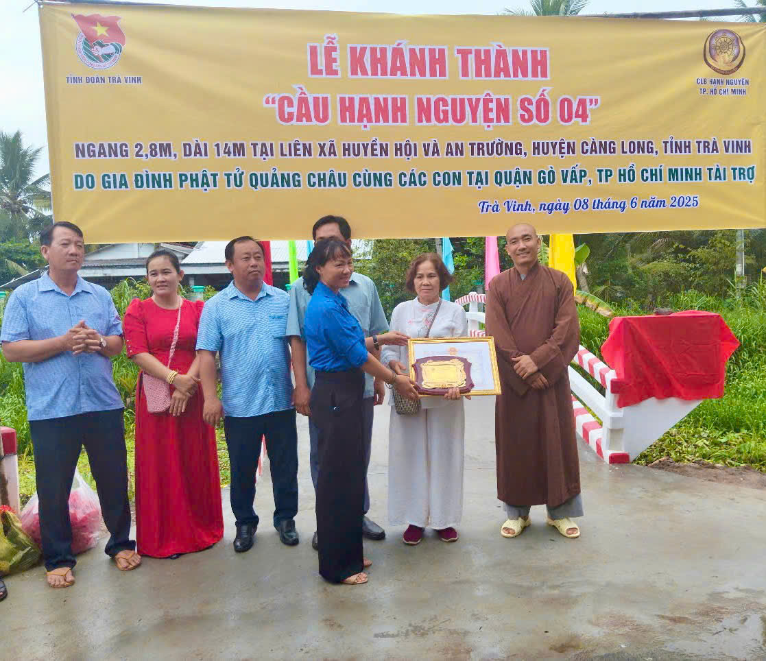 Cầu Hạnh Nguyện số 04 được khởi công xây dựng từ ngày 29/3/2025 tại khu vực liên xã Huyền Hội – An Trường, huyện Càng Long. Cầu có chiều dài 14m, rộng 2,8m với kết cấu bê tông cốt thép kiên cố, đảm bảo an toàn trong lưu thông. Tổng kinh phí thực hiện công trình là 136 triệu đồng, do Gia đình Phật tử Quảng Châu – thành viên Câu lạc bộ Hạnh Nguyện TP. Hồ Chí Minh tài trợ kinh phí xây dựng và nhân dân địa phương đóng góp công sức. Trong không khí trang trọng của buổi lễ, đại diện đơn vị tài trợ, chính quyền địa phương và người dân đã có những phát biểu chân tình, chia sẻ niềm xúc động, phấn khởi khi Cầu Hạnh Nguyện số 4 được hoàn thành đúng tiến độ, đảm bảo chất lượng, sẵn sàng phục vụ nhu cầu đi lại, học tập, sản xuất của người dân. Ghi nhận sự đóng góp tích cực, nhân văn cho cộng đồng, Chủ tịch Ủy ban nhân dân tỉnh Trà Vinh đã có Bằng khen và tặng phẩm lưu niệm trao tặng Gia đình Phật tử Quảng Châu, đồng thời địa phương cũng gửi Thư cảm ơn nhằm thể hiện lòng tri ân sâu sắc đến đơn vị tài trợ.