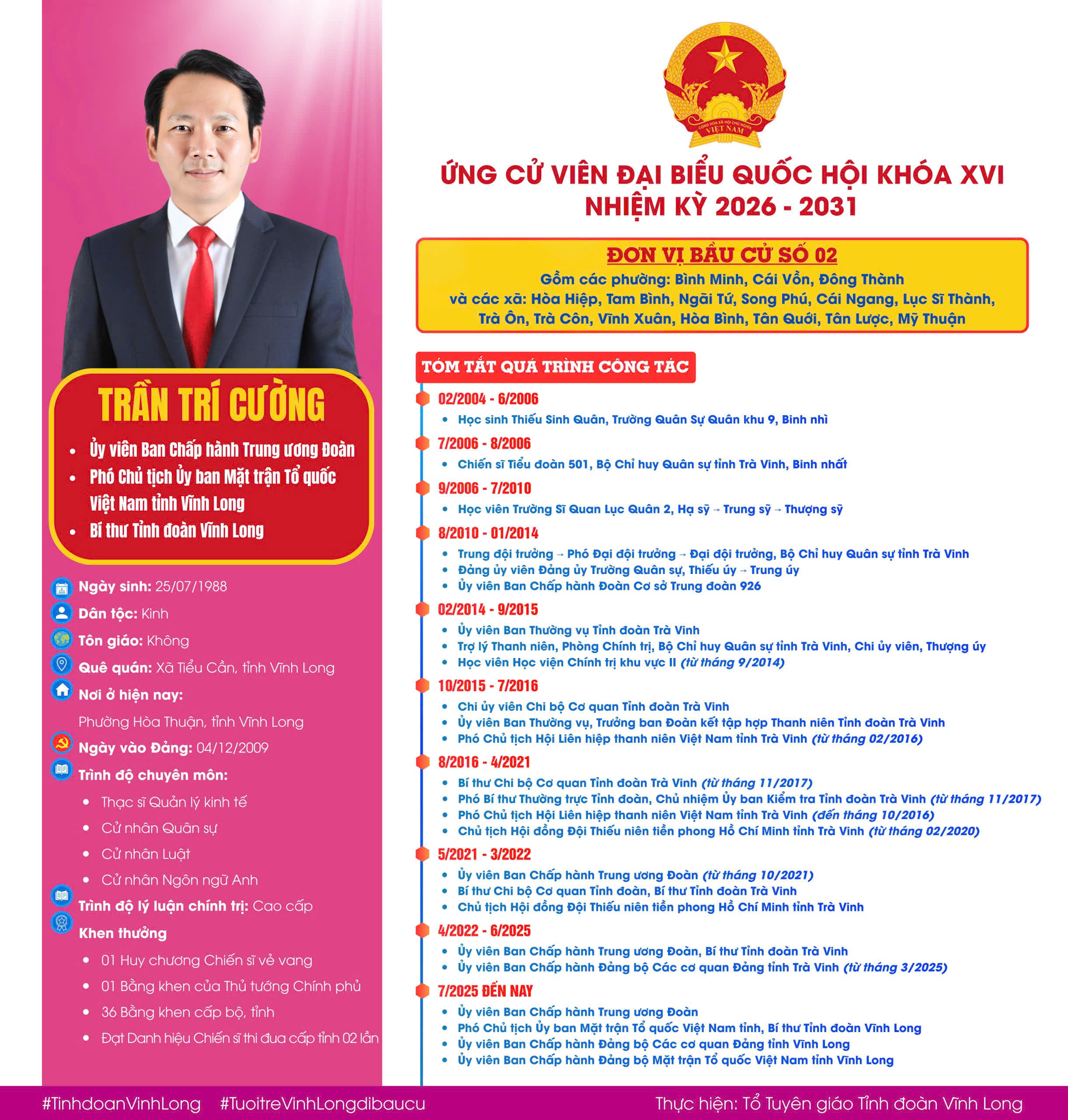 Đồng chí Trần Trí Cường – Ủy viên Ban Chấp hành Trung ương Đoàn, Phó Chủ tịch Ủy ban Mặt trận Tổ quốc Việt Nam tỉnh Vĩnh Long, Bí thư Tỉnh đoàn Vĩnh Long ứng cử đại biểu Quốc hội khóa XVI, tại đơn vị bầu cử số 02, tỉnh Vĩnh Long.