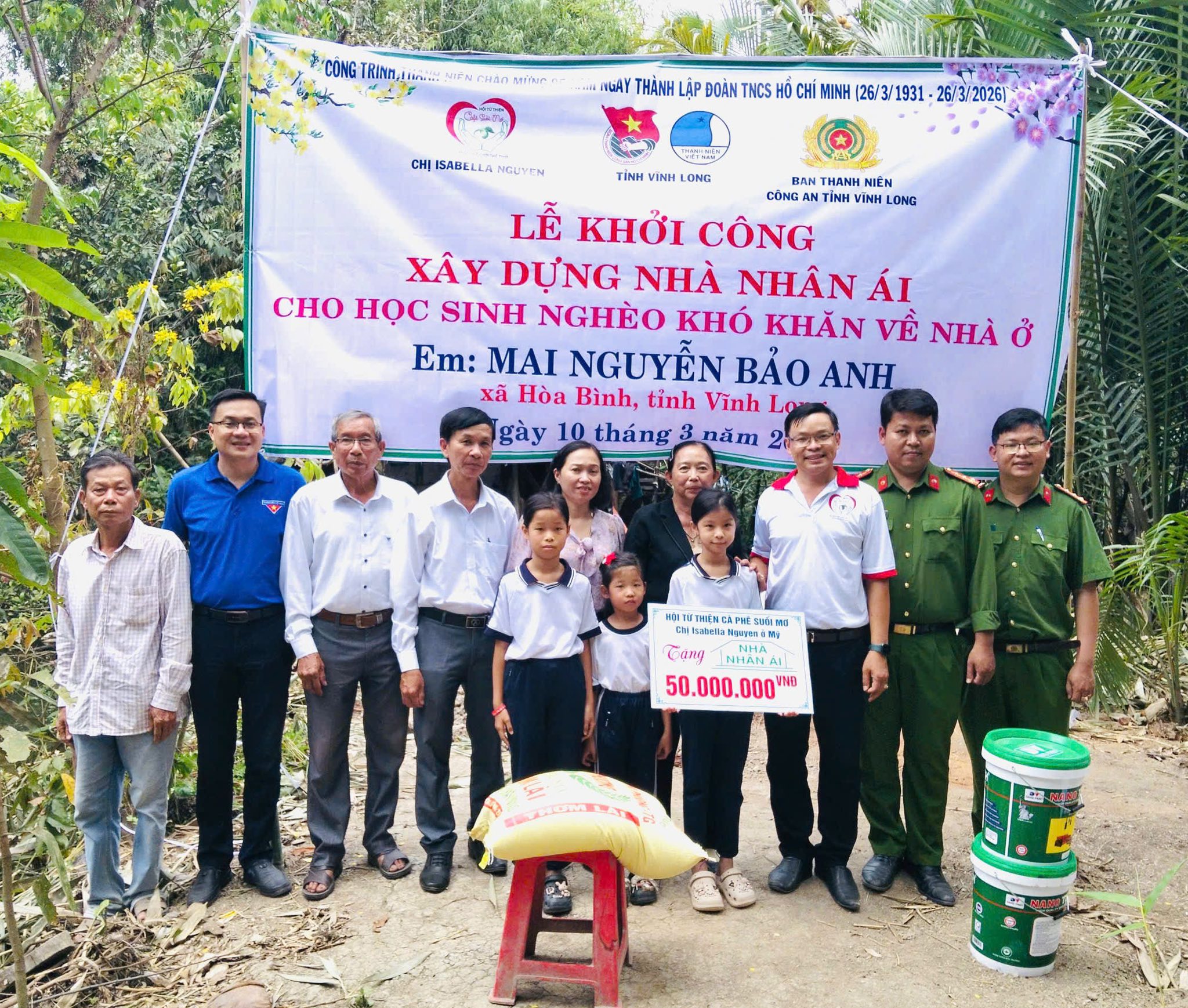 Nằm trong chuỗi hoạt động hưởng ứng Tháng Thanh niên năm 2026, hướng tới kỷ niệm 95 năm Ngày thành lập Đoàn TNCS Hồ Chí Minh (26/3/1931 – 26/3/2026) và chào mừng Ngày bầu cử đại biểu Quốc hội khóa XVI, Đại biểu Hội đồng nhân dân các cấp nhiệm kỳ 2026 – 2031. Sáng ngày 10/3/2026, Tỉnh đoàn, Hội LHTN Việt Nam tỉnh phối hợp Hội Từ thiện cà phê Suối mơ tổ chức Lễ Khởi công xây dựng Nhà nhân ái cho em Mai Nguyễn Bảo Anh – học sinh nghèo khó khăn về nhà ở tại xã Hòa Bình, tỉnh Vĩnh Long.