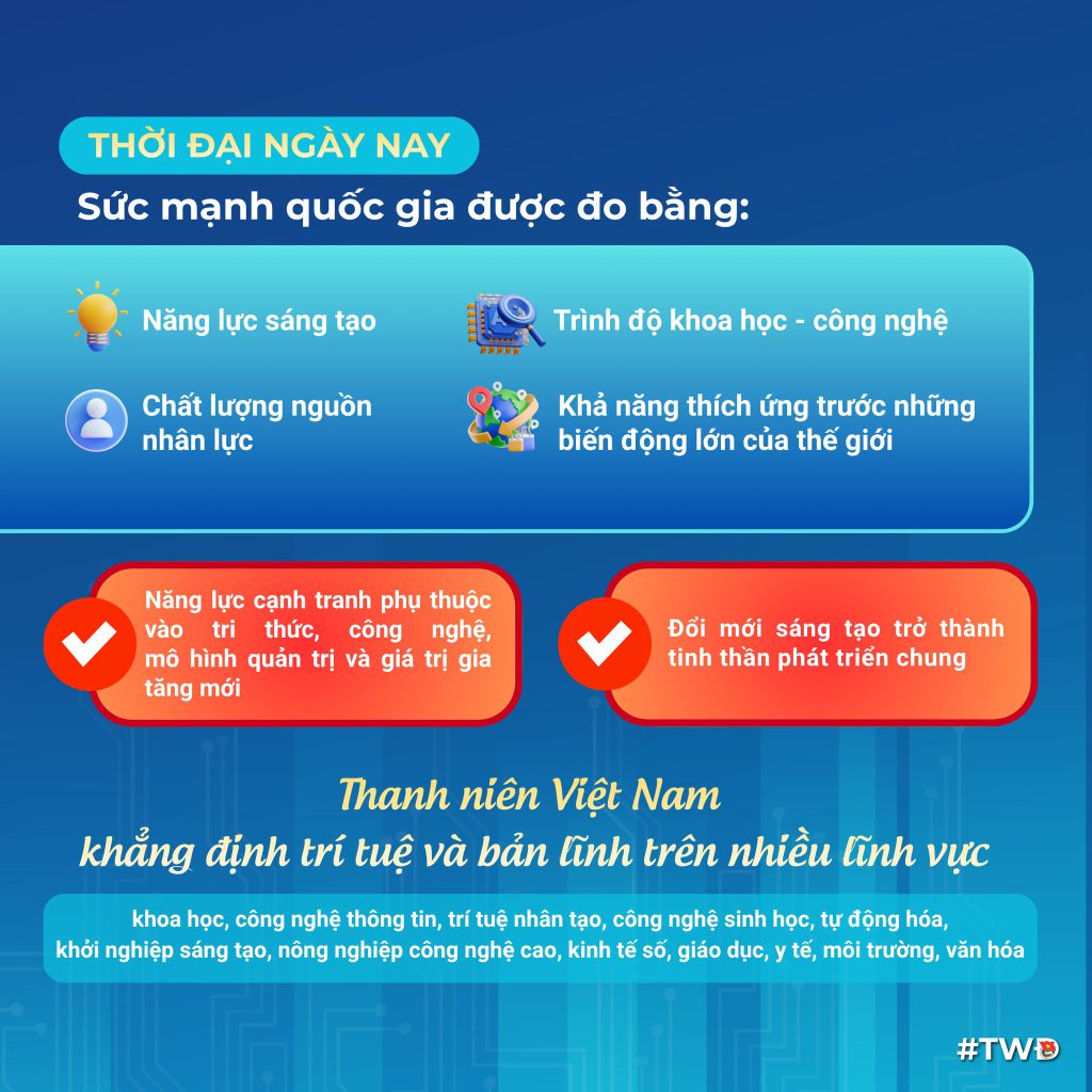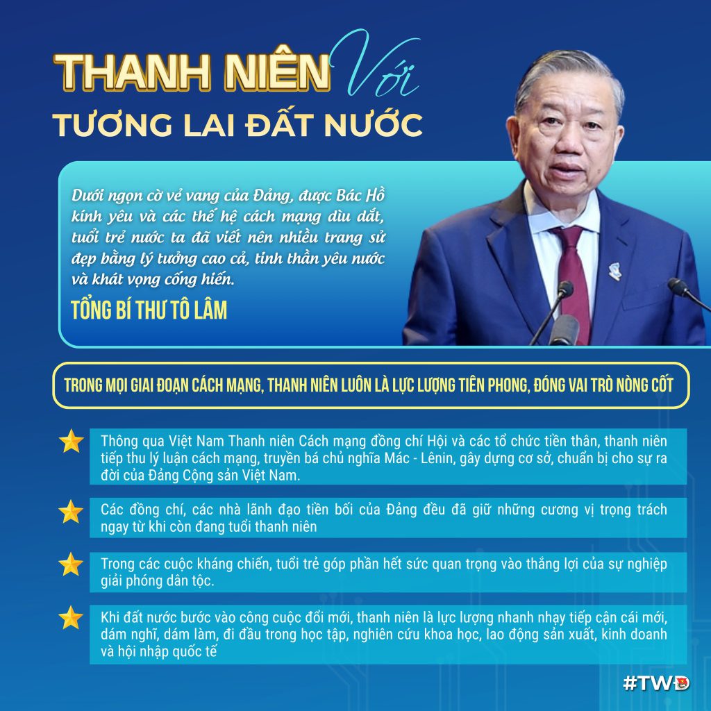Ngày 24/3/2026, Tổng Bí thư Tô Lâm đã có bài viết “Thanh niên với tương lai đất nước”, nhân dịp 95 năm Ngày thành lập Đoàn TNCS Hồ Chí Minh (26/3/1931-26/3/2026), trong đó nhấn mạnh: Dưới ngọn cờ vẻ vang của Đảng, được Bác Hồ kính yêu và các thế hệ cách mạng dìu dắt, tuổi trẻ nước ta đã viết nên nhiều trang sử đẹp bằng lý tưởng cao cả, tinh thần yêu nước và khát vọng cống hiến. Trung ương Đoàn TNCS Hồ Chí Minh trân trọng giới thiệu bộ Infographics tóm tắt thông tin chính có trong bài viết của đồng chí Tổng Bí thư.