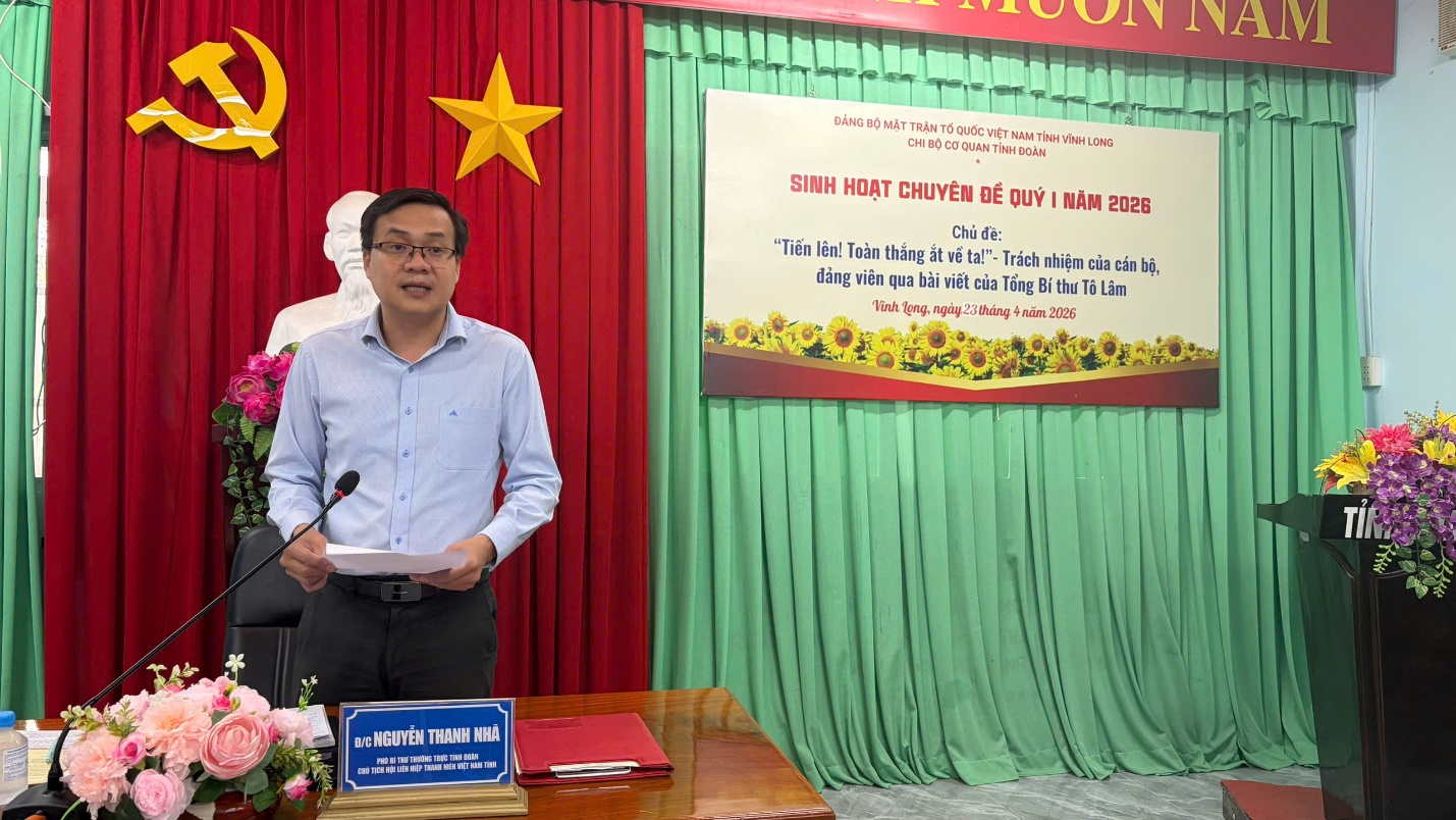 Nhằm nâng cao nhận thức, ý thức trách nhiệm, phát huy tính chủ động, sáng tạo của cán bộ, đảng viên, đoàn viên trong học tập và làm theo tư tưởng, đạo đức, phong cách Hồ Chí Minh. Qua đó, tạo sự thống nhất trong ý chí và hành động trong cán bộ, đảng viên, đoàn viên, tạo sự chuyển biến tích cực trong việc học tập và làm theo lời Bác. Ngày 23/4/2026, tại Hội trường cơ quan Tỉnh đoàn, Chi bộ Tỉnh đoàn tổ chức chương trình sinh hoạt chuyên đề quí I năm 2026 với chủ đề “Tiến lên! Toàn thắng ắt về ta!” – Trách nhiệm của cán bộ, đảng viên qua bài viết của Tổng Bí thư, Chủ tịch nước Tô Lâm.