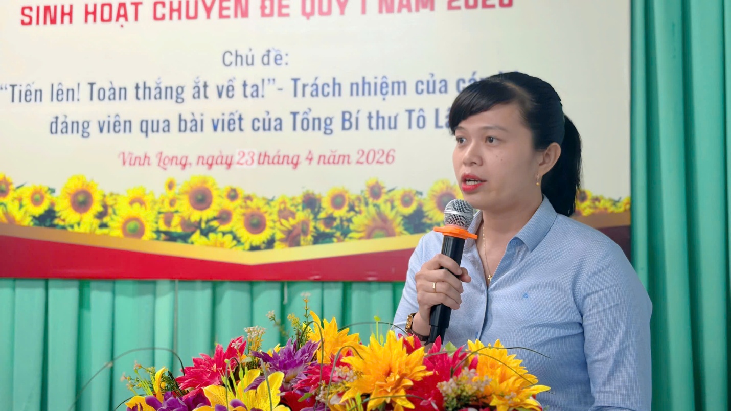 Đồng chí Trần Thị Ngọc Thoại – Đảng viên Chi bộ báo cáo chuyên đề bài viết “Tiến lên, toàn thắng ắt về ta” của Tổng Bí thư, Chủ tịch nước Tô Lâm